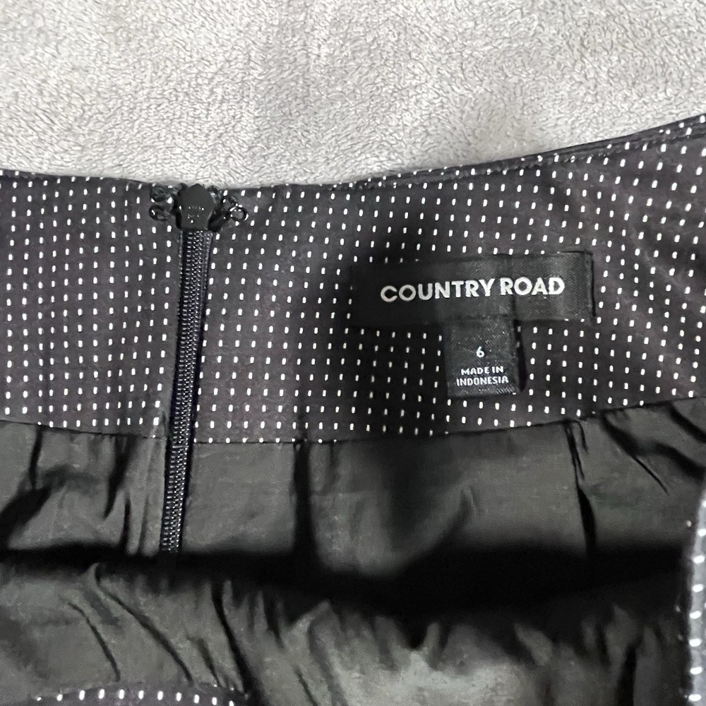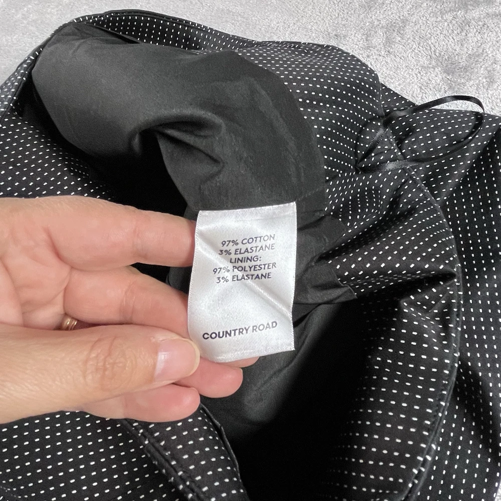 Size: 6 Accents: Zipper Season: Autumn, Spring, Summer, Winter Size Type: Regular Style: Straight & Pencil Colour: Black Material: 97% Cotton 3% Elastane Brand: Country Road Vintage: No Department: Women Fabric Type: cotton Pattern: Polka Dot Theme: Countries Type: Skirt Occasion: Business, Casual, Party/Cocktail, Travel, Workwear Closure: Zip Rise: Mid