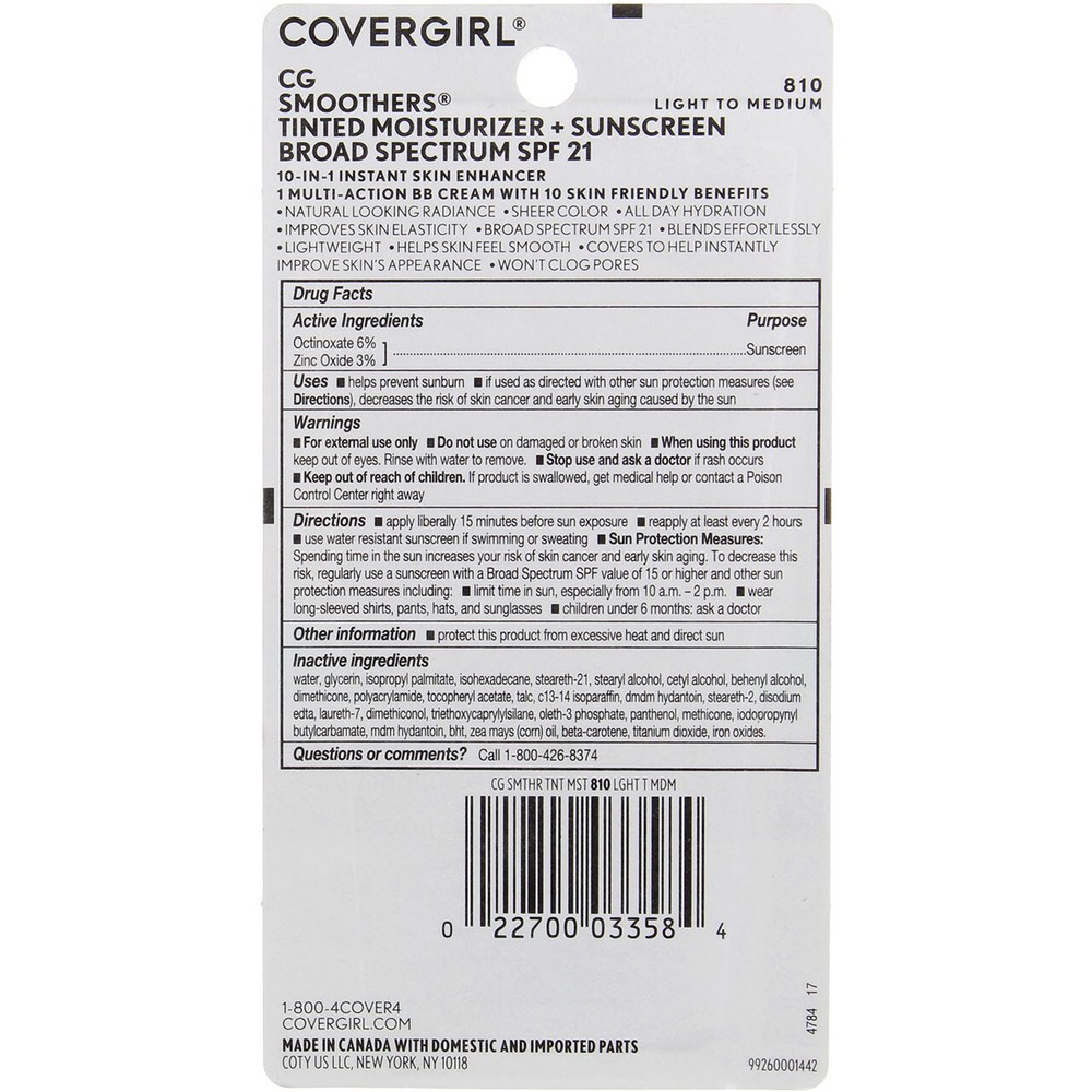 Product Description Smoothers bb cream answers 10 of your skincare needs in a single tube. Pamper your skin with an instant skin enhancer that provides natural radiance with a combination of all day hydration, lightweight, sheer coverage, and broad spectrum spf 15 protection. Experience cg smoothers bb cream’s 10 skin-friendly benefits today. Ingredients Active Ingredients: Octinoxate (6%), Zinc Oxide (3.0%); Inactive Ingredients: Water, Glycerin, Isohexadecane, Isopropyl Palmitate, Oleth 3 Phosphate, Sucrose Polycottonseedate, Tocopheryl Acetate (Vitamin E), Iodopropynyl Butylcarbamate, DMDM Hydantoin, Steareth 21, Steareth 2, Stearyl Alcohol, Behenyl Alcohol, Talc, Polyacrylamide, Dimethicone, Dimethiconol, Panthenol, C13 14 Isoparaffin, Disodium EDTA, BHT, Beta Carotene (Vitamin A), Methicone, Cetearyl Alcohol, Laureth 7, Titanium Dioxide. Instructions Use your fingers or a sponge to apply foundation to forehead, cheeks and chin then smooth outwards blending carefully around hair and jawline. Clean sponge with soap and water. Dry completely before use or storage. Apply before sun exposure. Product Description Smoothers bb cream answers 10 of your skincare needs in a single tube. Pamper your skin with an instant skin enhancer that provides natural radiance with a combination of all day hydration, lightweight, sheer coverage, and broad spectrum spf 15 protection. Experience cg smoothers bb cream‚Äôs 10 skin-friendly benefits today. Ingredients Active Ingredients: Octinoxate (6%), Zinc Oxide (3.0%); Inactive Ingredients: Water, Glycerin, Isohexadecane, Isopropyl Palmitate, Oleth 3 Phosphate, Sucrose Polycottonseedate, Tocopheryl Acetate (Vitamin E), Iodopropynyl Butylcarbamate, DMDM Hydantoin, Steareth 21, Steareth 2, Stearyl Alcohol, Behenyl Alcohol, Talc, Polyacrylamide, Dimethicone, Dimethiconol, Panthenol, C13 14 Isoparaffin, Disodium EDTA, BHT, Beta Carotene (Vitamin A), Methicone, Cetearyl Alcohol, Laureth 7, Titanium Dioxide. Instructions Use your fingers or a sponge to apply foundation to forehead, cheeks and chin then smooth outwards blending carefully around hair and jawline. Clean sponge with soap and water. Dry completely before use or storage. Apply before sun exposure. Disclaimer The product descriptions and instructions provided by Vitabox are for informational purposes only and are qualified in their entirety by the information available from manufacturers of the products. You should carefully read all product packaging, and contact the manufacturer with any questions before using a product. While we endeavor to ensure that product descriptions are current, manufacturers sometimes change their products. We are not liable for inaccuracies or misstatements about products. We do not provide medical advice or recommendations. You should not use the information provided by Vitabox for diagnosing or treating a health problem or disease. If you have or suspect that you have a medical problem, immediately contact your health care provider. Information and statements regarding dietary supplements have not been evaluated by the Food and Drug Administration or any other government agency and are not intended to diagnose, treat, cure, or prevent any disease.