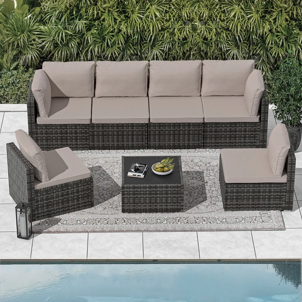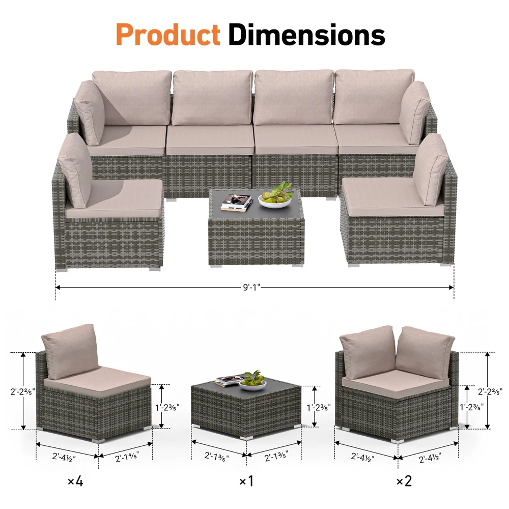[Sturdy and Enduring Outdoor Patio Furniture] Experience the durability and reliability of this 7-piece patio furniture set. Made with premium PE rattan and a robust powder-coated steel frame, this 7-piece patio furniture set is designed to endure all weather conditions, guaranteeing years of outdoor pleasure. Whether your outdoor space is a balcony, lawn, garden, or poolside, this set is ideal for all settings. [Comfortable Seating with Contemporary Style] Experience ultimate comfort with 3.9 inch thick seat cushions and an ergonomic backrest in this patio conversation set. Designed to provide optimal support, the durable and weather-resistant cushions ensures you and your family can relax outdoors for extended periods. [Easy to Maintain] Maintaining this patio furniture set is effortless. The cushion covers feature a zipper design for easy removal and cleaning. The splash-proof material ensures simple upkeep, and the tempered glass top of the coffee table can be cleaned with a damp towel easily. [Flexible Sectional Conversation Set] This 7-piece sectional set offers flexible configuration options, allowing you to arrange the sofas to fit your space requirements. Perfect for both small and large areas, this set adapts to different room sizes, giving you the freedom to create your ideal outdoor seating arrangement. [Full Set for Optimal Outdoor Living] This outdoor furniture set includes four single-seat(26" x 28.5" x 26.4"), two armchairs (28.5" x 28.5" x 26.4"), and a coffee table (25.6" x 25.6" x 14.6"). With this comprehensive set, you can make the most of the warm weather and fully enjoy outdoor living. [Simple Assembly] We've included all the essential hardware and tools for assembling the patio sofa set. An adult can effortlessly put together each sofa in just 15 minutes. Modern Shade provides free replacement for any defective, damaged, or missing parts. If you have any questions about our product, please reach out to us.