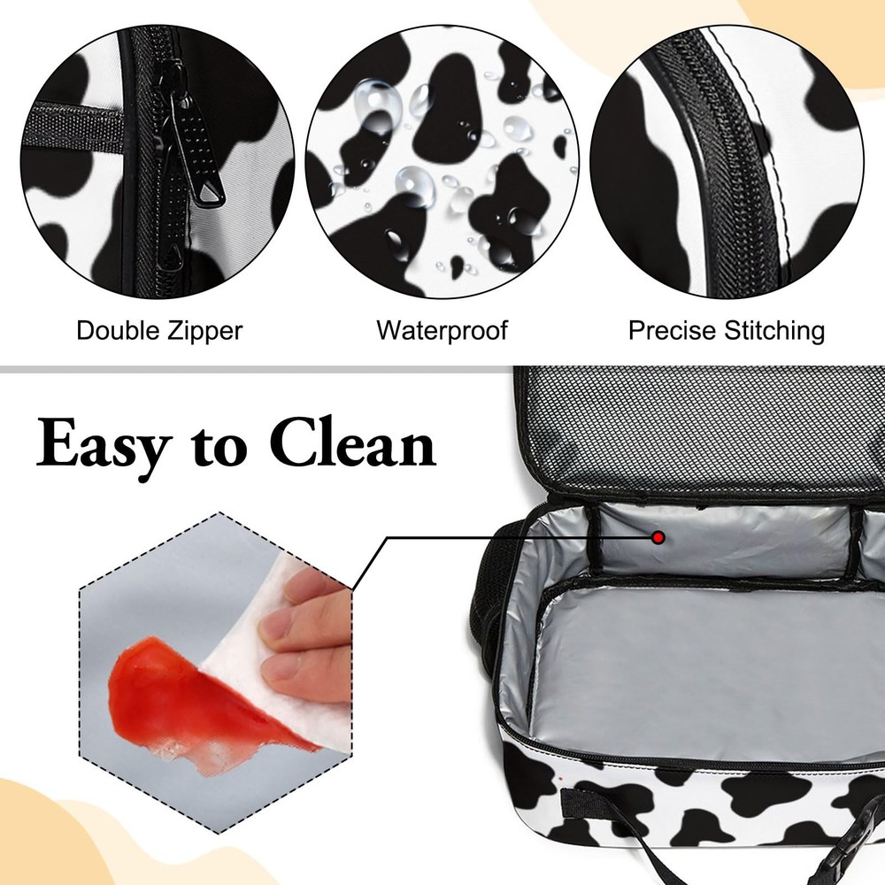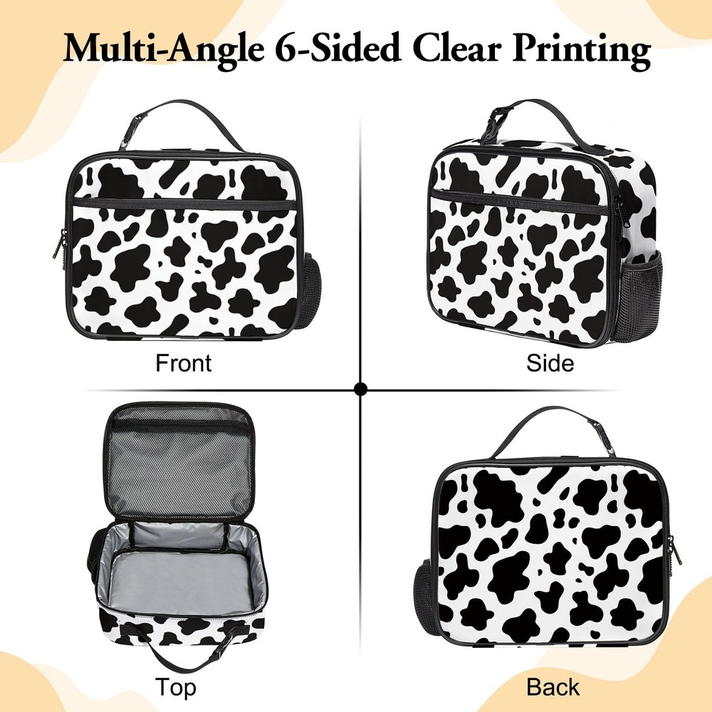 1. This cow-print lunch box is such a fun and practical choice! The insulation keeps food fresh, and the large size fits everything I need. Love the built-in water bottle holder—super convenient for school or work. The waterproof material is a lifesaver, and the cute design always gets compliments. Perfect gift for anyone who loves style and functionality!