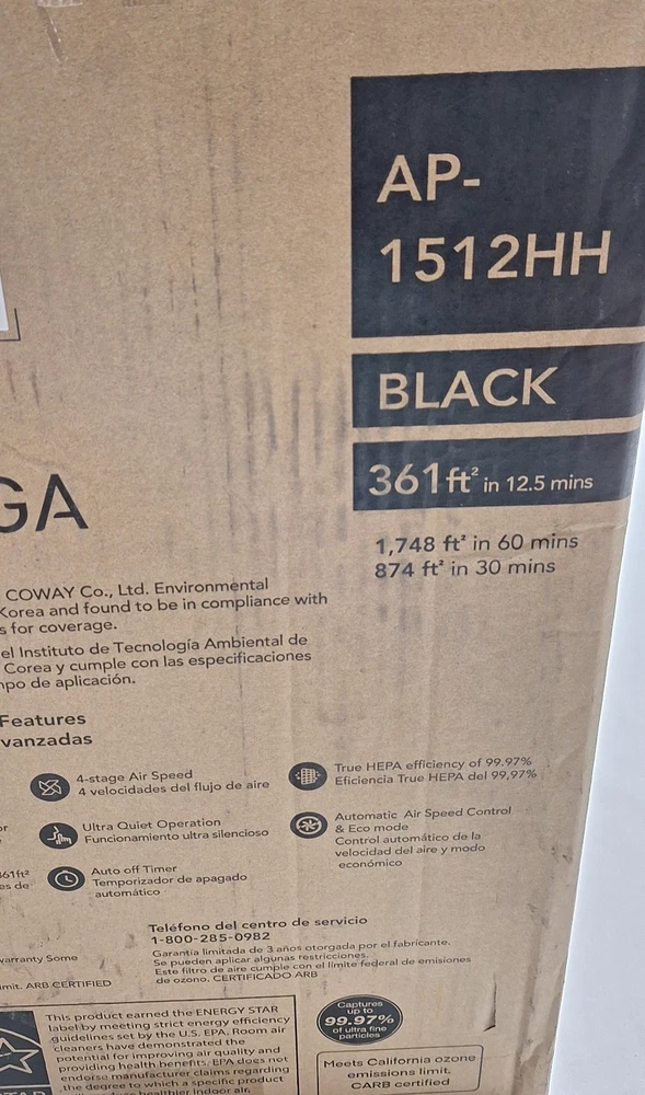 ENJOY CLEAN AND REFRESHING AIR IN YOUR HOME ALL THE SEASONS THROUGH THE YEAR. THE COWAY AIRMEGA TRUE HEPA AIR PURIFIER EFFECTIVELY REMOVES IMPURITIES FROM YOUR HOMES AIR. IT CAN TREAT ROOMS UP TO 361 SQUARE FEET IN 12.5 MINUTES, 874 SQUARE FEET IN 30 MINUTES, AND 1748 SQUARE FEET IN 60 MINUTES WITH RELIABLE 4-STAGE FILTRATION INCLUDING A TRUE HEPA FILTER. YOU CAN EASILY OPERATE THIS AIR PURIFIER WITH ITS INTUITIVE TOUCH CONTROLS. IT'S PROGRAMMED WITH A NUMBER OF SMART FEATURES INCLUDING AN AIR QUALITY INDICATOR, ECO-MODE, AND A TIMER. LOOKING OUT FOR MOTHER EARTH AND YOUR ENERGY BILL, THIS AIR PURIFIER IS ENERGY STAR RATED. ● RELIABLE FILTRATION : THIS AIR PURIFIER HAS 4-STAGE FILTRATION INCLUDING A PRE-FILTER, ODOR FILTER, HEPA FILTER, AND IONIZER...... ● EASY OPERATION : YOU CAN EASILY OPERATE THIS AIR PURIFIER WITH ITS INTUITIVE TOUCH CONTROLS..... ● SMART FEATURES : IT'S PROGRAMMED WITH A NUMBER OF SMART FEATURES INCLUDING AN AIR QUALITY INDICATOR, ECO-MODE, AND A TIMER..... ● THIS PURIFIER IS ENERGY STAR RATED TO OPERATE FOR YEARS TO COME IN YOUR HOME...... ■ BRAND NEW SEALED BOX- BLACK-I ONLY OPENED THE BOX FOR PICTURES..... ● RETAIL PRICE $227.26