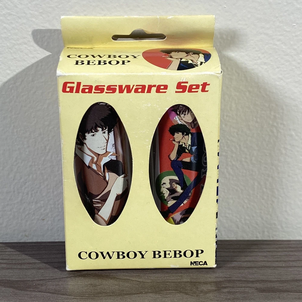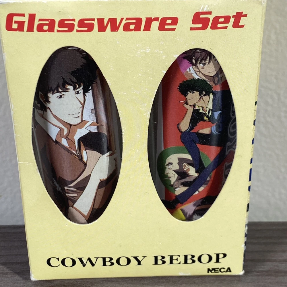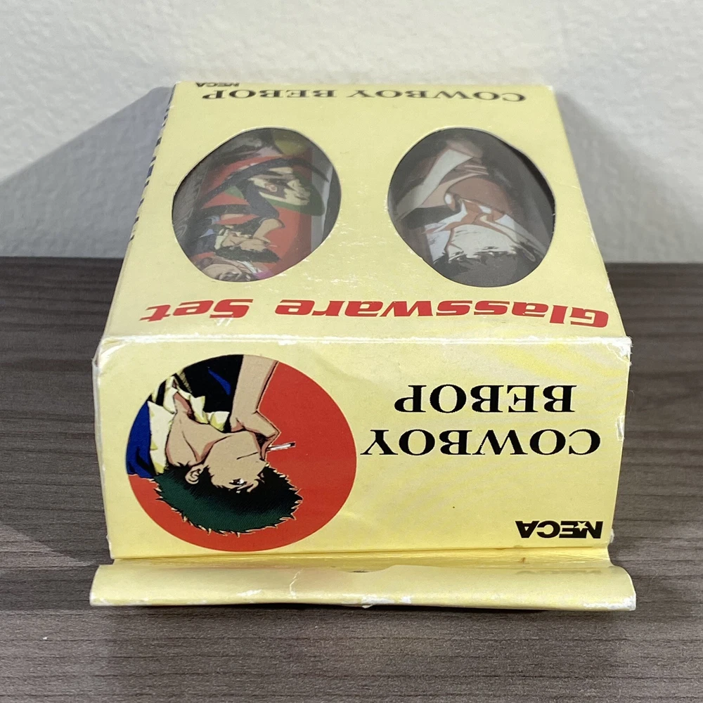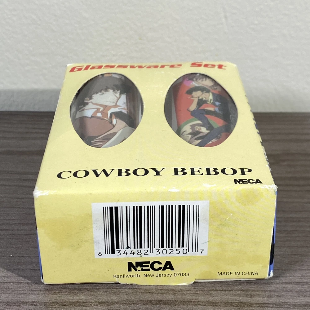 This is a NECA glassware set featuring characters from the anime series Cowboy Bebop. The set includes four 4-inch shot glasses with designs of Spike Spiegel and Faye Valentine. The glasses were manufactured in 2002 and are made of glass. They are part of the Sunrise and Dark Horse franchises and are perfect for fans of the Cowboy Bebop TV show and comic books.