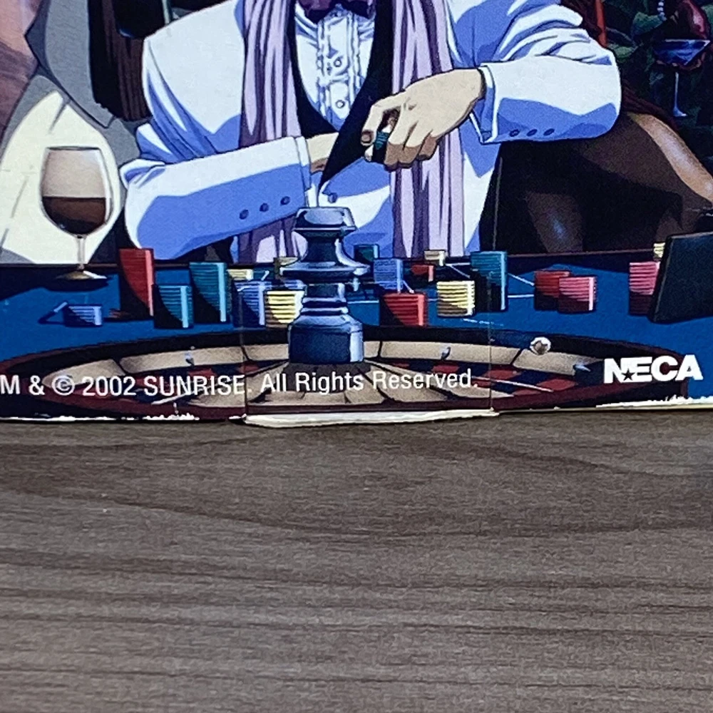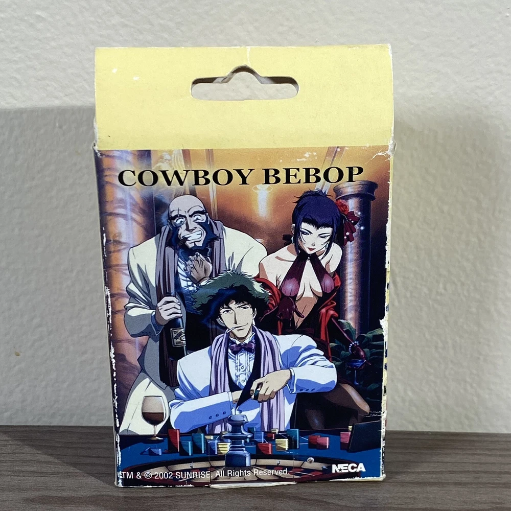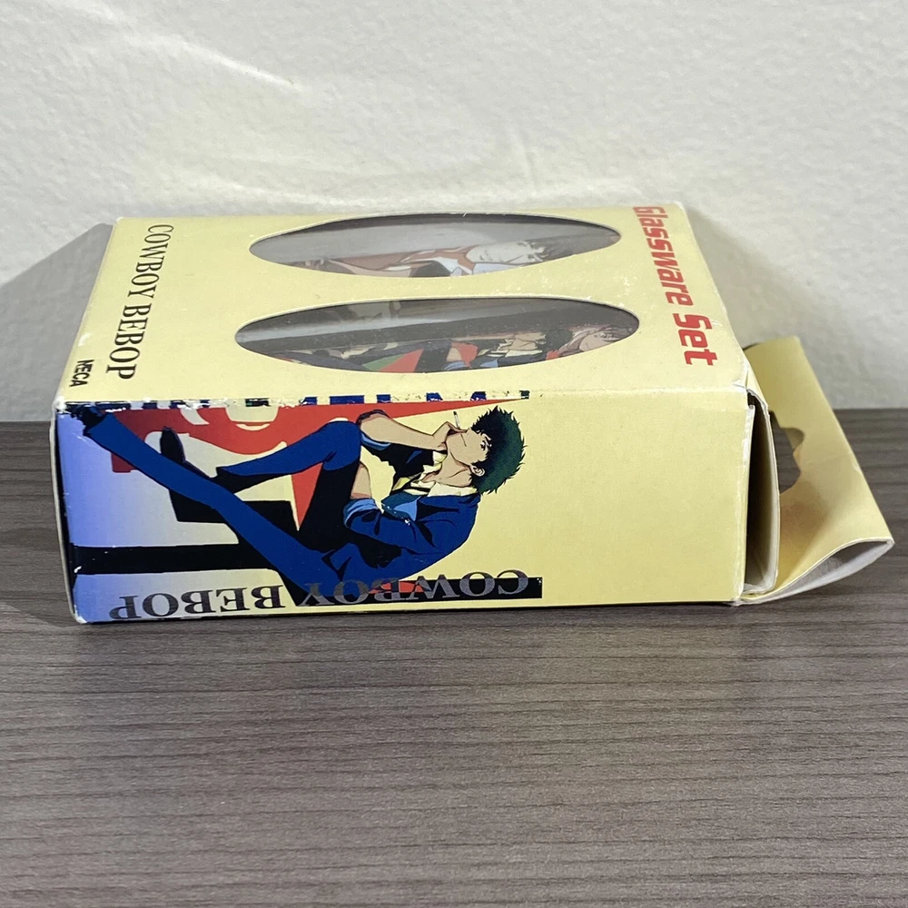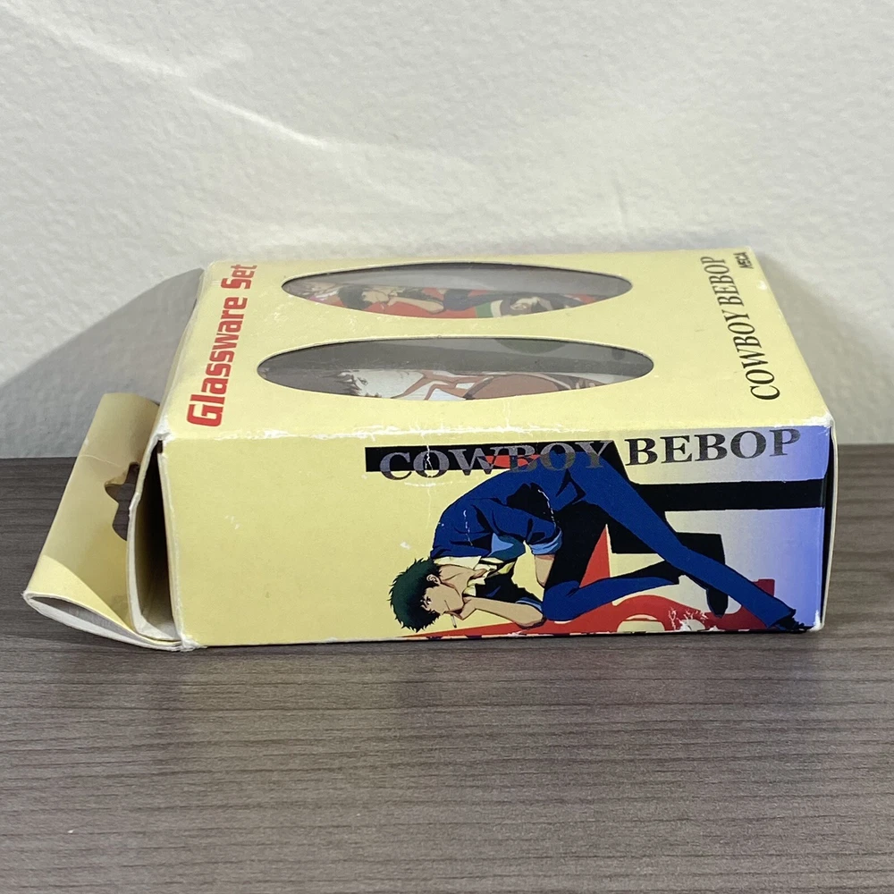 This is a NECA glassware set featuring characters from the anime series Cowboy Bebop. The set includes four 4-inch shot glasses with designs of Spike Spiegel and Faye Valentine. The glasses were manufactured in 2002 and are made of glass. They are part of the Sunrise and Dark Horse franchises and are perfect for fans of the Cowboy Bebop TV show and comic books.