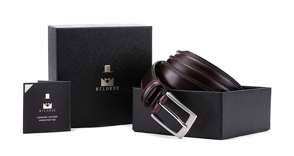 About: : is a highly experienced Manufacturer and creative Designer of more than 20 years, and provides a wide variety of high quality belts for men. Goal to earn our customers’ respect via ✔ Premium Quality ✔ Unique Design ✔ Valuable ✔ 100% Satisfaction ✔ Excellent Service Visual Features genuine leather men belts features a elegant design with a classic smooth finish and beautiful carefully crafted stitching on top & bottom, a single loop to hold end of strap with a single prong buckle. The variety of colors and sizes to choose makes the Belts complement for dressing with any outfit to give you a sophisticated look and feel. Unique Design The leather belts styles, were carefully selected and designed by the world-class designers of men’s fine luxury goods, known for modern and upscale designs for men's clothing. The extraordinary beauty, durability and functionality meet your daily needs. Size Fits Well BE SURE TO ORDER SAME SIZE AS YOUR WAIST/PANTS SIZE. Please refer to the size chart in the last the image for the perfect fit. Belt size equals measurement in inches when measured from inner end of buckle to 3rd(the middle out of 5 in total) hole. Awesome Gift Packaging We know the hassle of looking for that perfect gift, come valentine’s day gifts for him as well as Christmas, Father’s Day gifts, anniversary gifts, birthday gifts for men or just any lucky day. No more worries, he will loves our ’s classic leather belts as well as our fashion gift packaging. Order with We sincerely serve you; promise 100% satisfaction for our customers and potentials. You can return or full in any time, no time limited. We are so sure and confident you'll love our leather belt. The difference is in detail. PREMIUM QUALITY: 100% Pure Genuine Leather Belt. Handmade, Highly constructed for longer endurance and better upholding. The difference is in detail. PRODUCT DIMENSIONS:1 1/4" (33mm) strap width; 2 1/4" x 1 3/4" Nickle free single prong buckle, are made with alloy to create a substance with greater strength and resistance to corrosion. VERSATILE FITS:It is an ideal men accessory, to wear as an everyday leather dress belt. Higly suit pants, jeans, khakis and any formal wear; never go out of style with classic yet stylish design of this belt. EASY SIZE: For a perfect fit, order size larger than your waist/pants size. For example, if your waist size is 34 inch, select size 36(waist 34).Please refer to the size chart among the images for clear instructions. GIFT PACKAGE: Our leather dress belt packed in a gift box.It's great as a present to surprise your friends,family and someone you love in any special days or anniversary. RISK FREE ORDERS - We are committed to making our customers satisfied with dress leather belt. If there is any problem with the product, us without hesitation.