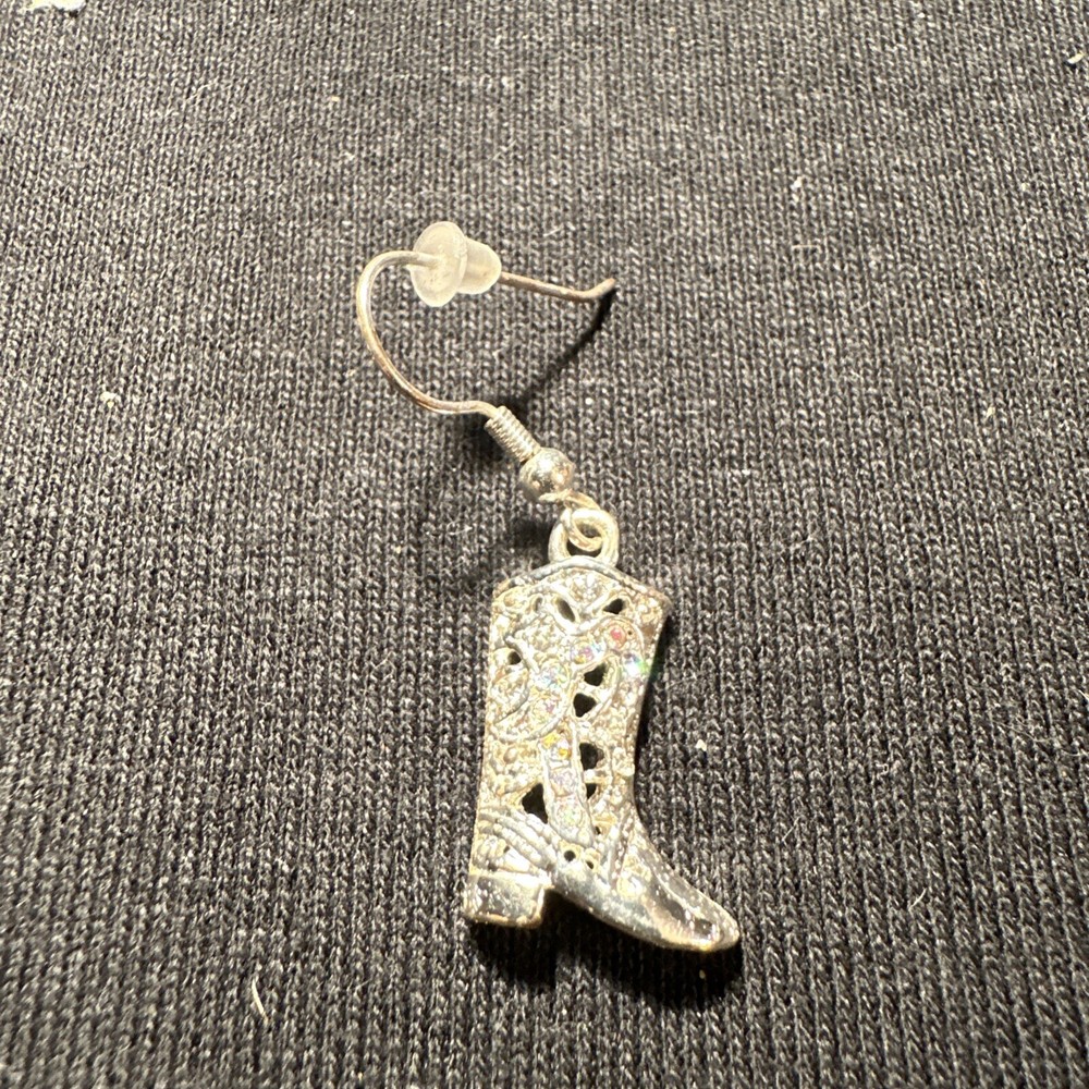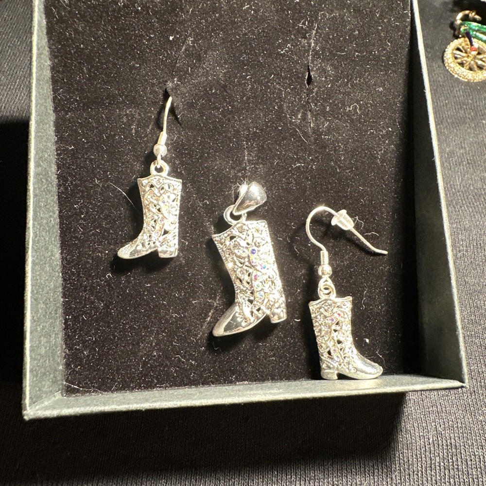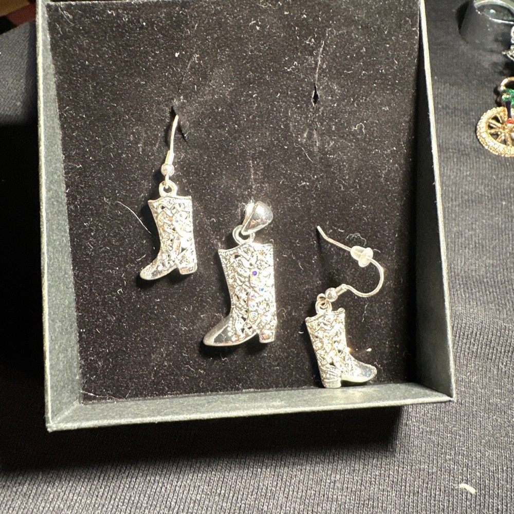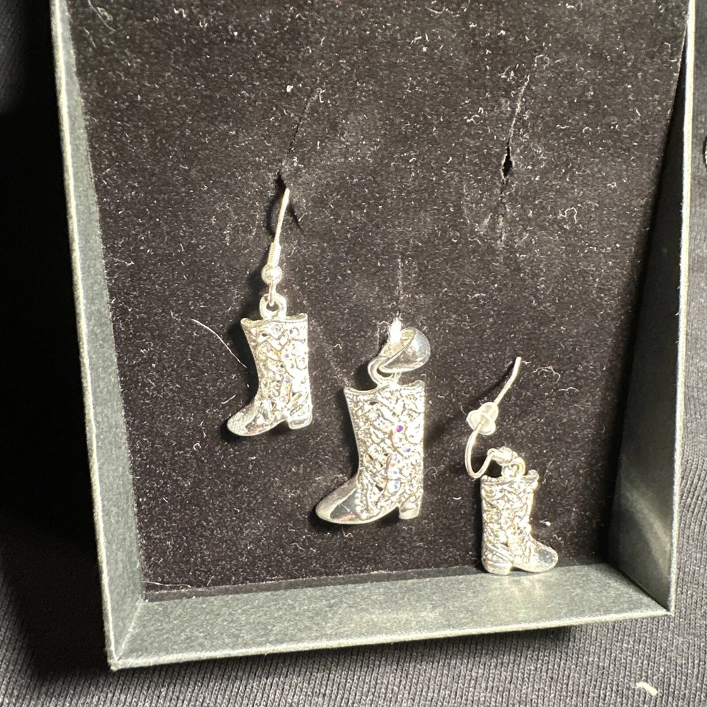 Cowboy Boot Earrings And Charm Silver Tone 1.5 Inches Long