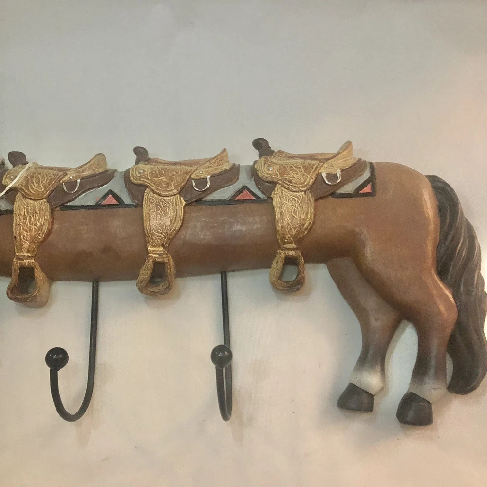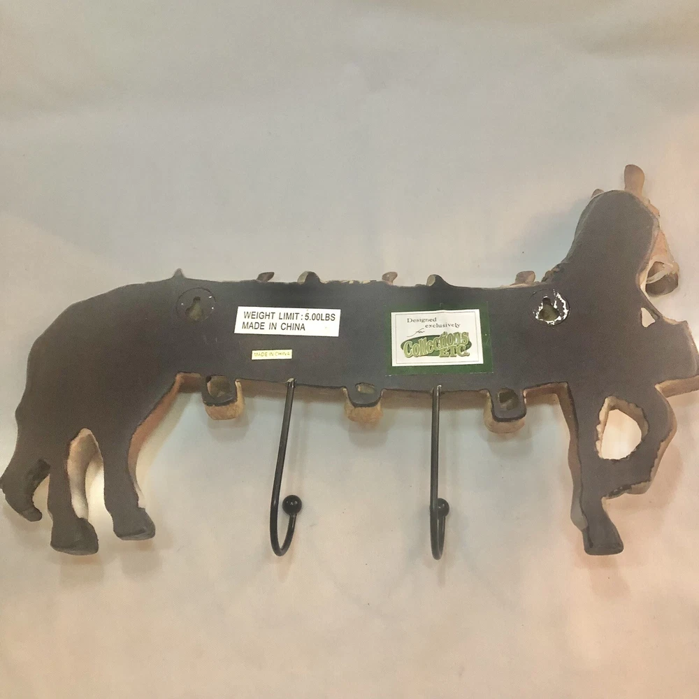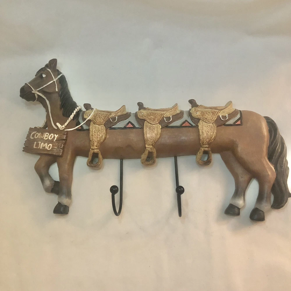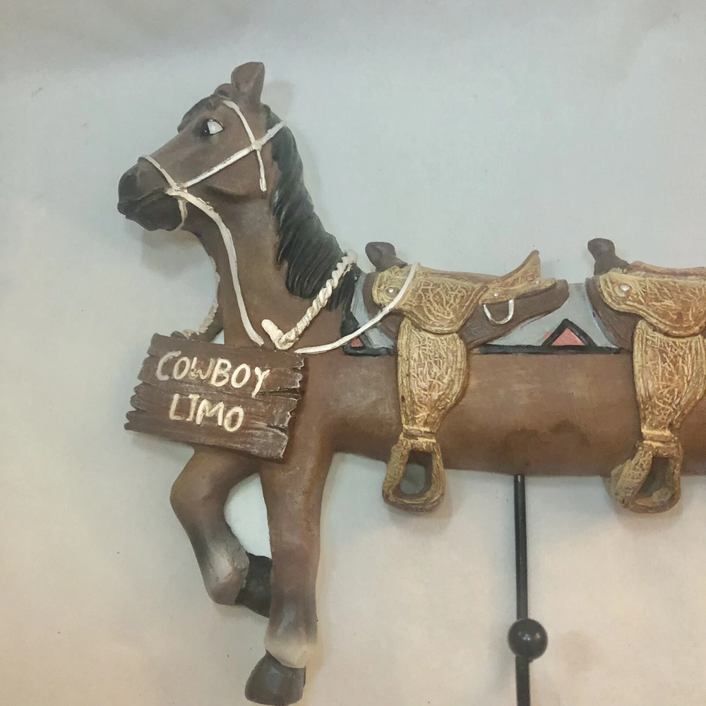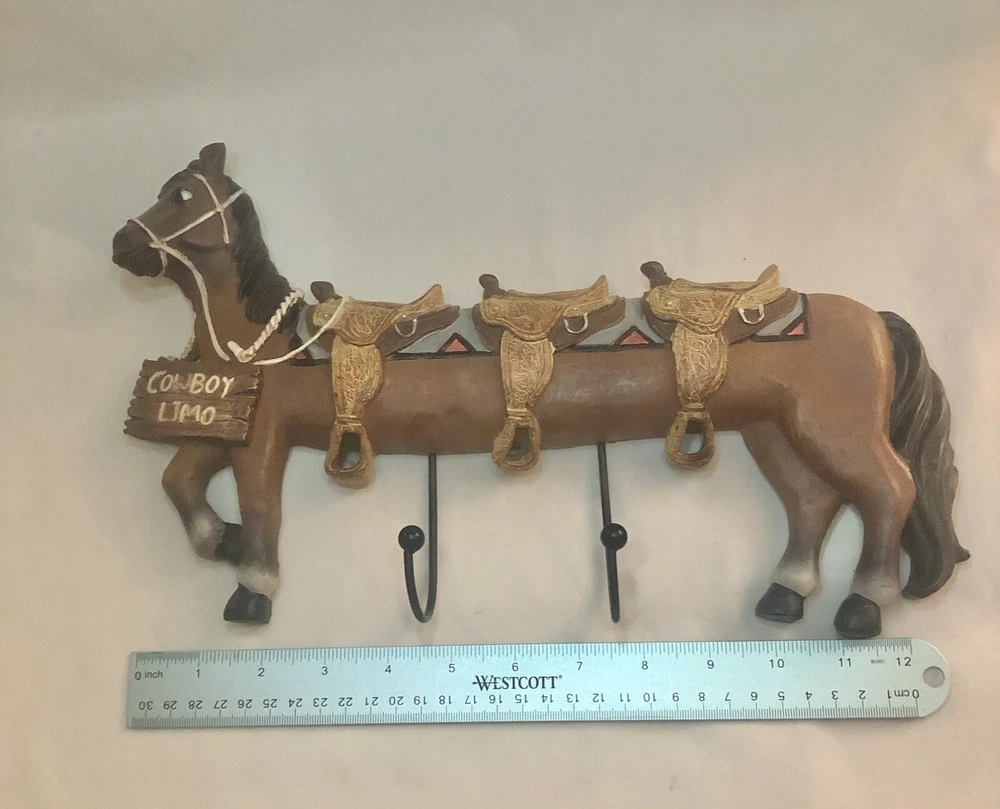 Funny and whimsical stretched horse “cowboy limo” double hook wall hanging. About 13” long with two nail holes in the back for hanging. Like new condition.