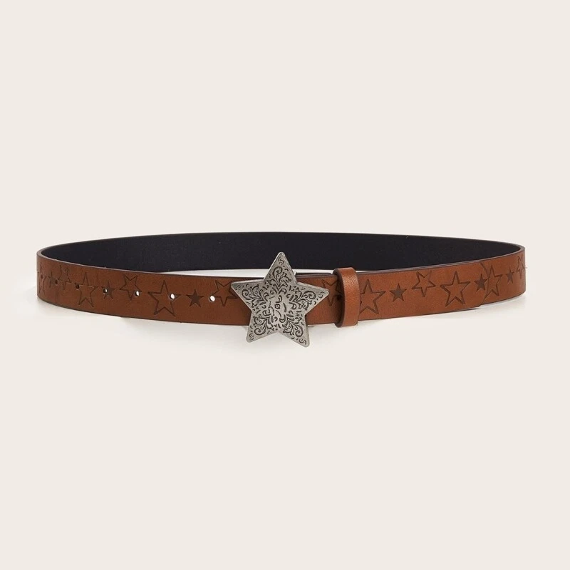 Cowboy Star Pattern Buckle Belt Woman Faux Leather Engraved Waist Belt for Jeans