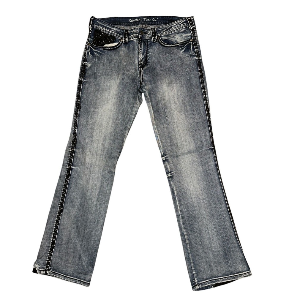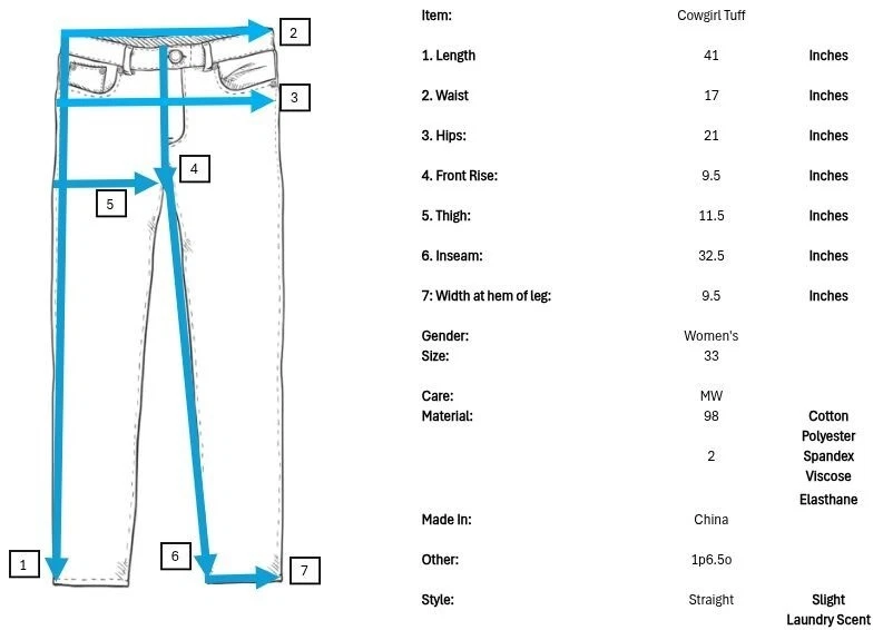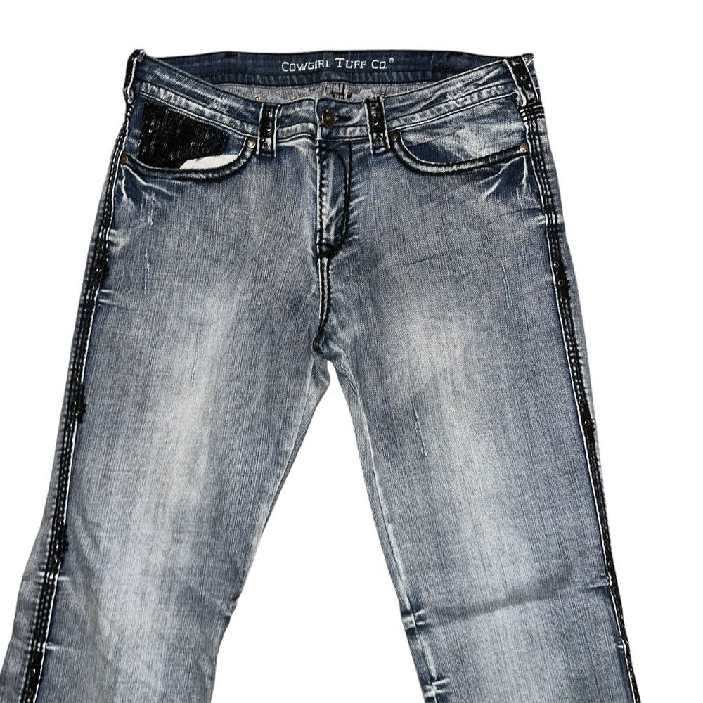 Features: • Brand: Cowgirl Tuff • Type: Jeans, Bottoms • Style: Straight Leg • Front: Flat • Season: Spring, Summer, Fall, Winter • Pattern: Solid • Made in China • Care: Machine Wash • Color: Blue, Black • Wash: Light • Features: Embroidered, Studded, Sequins, Rhinsetones, Distressed, Frayed • Closure: Zipper Fly • Material: Denim, 98% Cotton, 2% Spandex • Size: Women's Plus Size 33 • Condition: Good, Some fading & wear, Laundry scent • Other: Western, Cowboy, Cowgirl, Dance, Rodeo, Show Measurements are Approximate: Length: 41 in / 104 cm Waist: 17 in / 43 cm Hips: 21 in / 53 cm Front Rise: 9.5 in / 24 cm Thigh: 11.5 in / 29 cm Inseam: 32.5 in / 83 cm Width at hem of leg: 9.5 in / 24 cm Orders shipped within 1-2 business days. 0101010001