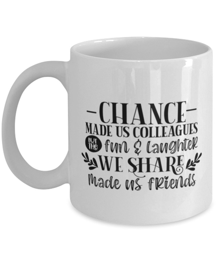 Coworker Coffee Mug Chance Made Us Colleagues Fun And Laughter We Share Made Us Product Details.. This high quality 11oz. ceramic white mug has a premium hard coat that provides crisp and vibrant color reproduction sure to last for years. Perfect for all hot & cold beverages. The highest quality printing possible is used. It will never fade no matter how many times you wash it. Material: 100% Ceramic. Print both sides. Dishwasher and Microwave Safe. High Gloss + Premium White Finish. Printed in the U.S.A. Personalized & Custom. We support personalized and custom mug to add custom, when placing an order, you can add notes to the "order note" in shipping address section. Also you can contact us directly via message. Shipping Info. Ready to ship in 1 to 2 business days, All products are made-to-order and proudly printed in the United States. Shipped by USPS and DHL, You will receive your order in 5-7 days. Replace & Refund. All products are defective during shipping broken, chipped will be replaced free of charge. You are not satisfied with the product, we will refund 100% money to you. If any other issues arise, please do not hesitate to message, we would be more than happy to assist you.