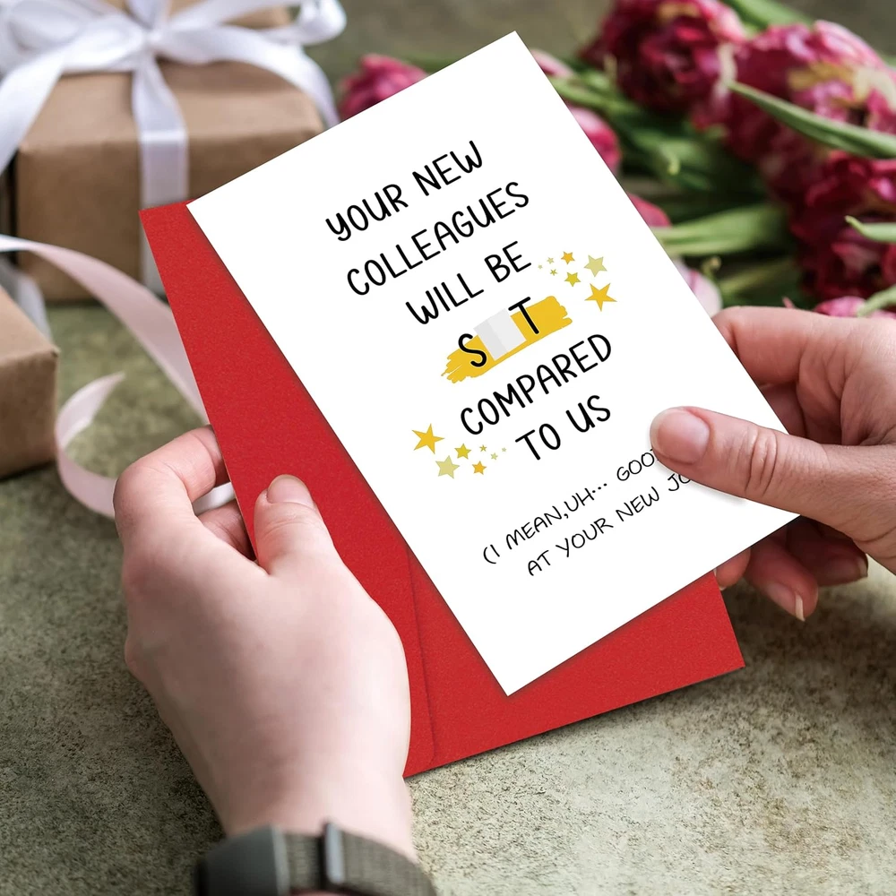 Store New Arrivals Add to Favorite View Feedback Contact Coworker Leaving Card Farewell Card, Funny Going Away Card Gift for Boss Colleague, Humor Congrats New Job Card, GOOD LUCK at YOUR NEW JOB Description Style 01 Number of Items 1 Color Compared to us Item Weight 1.13 ounces Pre-printed YOUR NEW COLLEAGUES WILL BE SHI COMPARED TO US, GOOD LUCK AT YOUR NEW JOB, and other thematic elements Product Dimensions 8 x 5.3 x 0.02 inches Size 8" x 5.3" 🎂 This Humor Coworker Leaving Card themed birthday wishes card is perfect for Coworkers and Colleagues. Designed with the wording 'YOUR NEW COLLEAGUES WILL BE SHI COMPARED TO US' ✨Perfect farewell card Goodluck Gift for your funny colleagues or a humorous leader, Use this funny card as a gift to express your gratitude to your leader or colleagues. 📐 Measuring at a whopping 8" x 5.3", this Going Away Card for coworker is sure to make an impact. It’s printed on high-quality 300gsm paper card suitable for any writing style, so you can leave a heartfelt message inside. And it comes complete with a sturdy gold rigid envelope to prevent damage during transit, plus a seal sticker wrapped in clear cellophane. Now that’s what we call quality! 🎁The inside of this farewell card has a simple, but elegant white background. This way, you get to personalize it with your own unique wishes and greetings. Whether it’s a funny joke or a heartfelt message, leave some love and happiness behind that’ll make their day. 🌎And don’t you worry about the text pattern printing of greeting card for friends! It’s crystal clear and guaranteed to last a long time. Plus, we stand behind our products and offer a satisfaction guarantee. So if you have any questions, our friendly customer service team is here to help! Product Description Policy on Product Sourcing and Fulfillment Dear Valued Customers, We would like to clarify an important aspect of our business operations to ensure transparency and trust in our relationship with you. Product Fulfillment: Fulfillment by Amazon (FBA): The products are stored in Amazon Fulfillment Centers. This storage solution ensures that the inventory is kept in a secure and climate-controlled environment, which helps maintain the quality and safety of the products. Efficient Delivery: Utilizing Amazon's fulfillment services allows us to leverage their robust logistics network to provide you with fast and reliable shipping. This means you receive your purchases in a timely manner with the added assurance of Amazon's trusted delivery systems. Customer Assurance: Quality Control: Every product is carefully selected and undergoes rigorous quality checks before being listed for sale. Our commitment is to provide you with high-quality items that meet your expectations. Secure Storage: Amazon's Fulfillment Centers are renowned for their high standards of security and efficiency. Your products are stored safely until they are shipped to you. Customer Support: Should you have any questions or concerns regarding your purchase, our customer support team is readily available to assist you. We are dedicated to ensuring your satisfaction with every transaction. We appreciate your business and are committed to providing you with a seamless and satisfactory shopping experience. Thank you for your trust and understanding. Sincerely, -Manager- Shipping Policy and Expectations Dear Valued Customers, We are committed to ensuring that your package arrives as quickly as possible. However, we kindly ask for your understanding regarding certain factors that may occasionally affect shipping times. Our Commitment: Prompt Processing: We strive to process and dispatch your orders promptly to minimize any delays. Reliable Shipping Partners: We work with reputable shipping companies to ensure your packages are handled with care and delivered efficiently. External Factors: While we do everything within our power to expedite your order, please note that some factors are beyond our control: Weather Conditions: Severe weather can impact shipping routes and cause delays. High Postal Traffic: During peak seasons, such as holidays, the increased volume of packages can lead to longer delivery times. Shipping Company Performance: The performance and schedules of shipping companies may vary, potentially affecting delivery times. We appreciate your patience and understanding in these situations. Rest assured, we are doing everything possible to get your package to you as soon as possible. Customer Support: If you have any questions or concerns about your order, please do not hesitate to contact us. Our customer support team is here to assist you and provide any necessary updates on your shipment. Thank you for your trust and continued business. Shipping Policy and Customer Satisfaction Shipping Information: Service Area: We offer shipping to the lower 47 states. Please confirm with us about the delivery date before completing your purchase. Thank you. Address Requirements: We do not accept P.O. Boxes. Please provide a physical address for delivery. Shipping Restrictions: Unfortunately, we are unable to ship items to the state of Ohio and California due to shipping agreements and restrictions. International Shipping: eBay International Shipping Hub: For shipping outside of the continental USA, we only use eBay's International Shipping Hub. The item is shipped to Illinois and then sent to the rest of the world. Duties and Taxes: International customers are responsible for all duties and taxes. Please continue to check out to calculate the shipping costs for your country. Inquiries: Messages regarding eBay's International Shipping Program must be directed to eBay exclusively. Customer Satisfaction: We try our very best to ensure every customer is completely satisfied. If there's a problem, please message us! We're happy to help. If you are happy with your purchase, we would really appreciate your positive feedback. Once positive feedback is left, our system will a