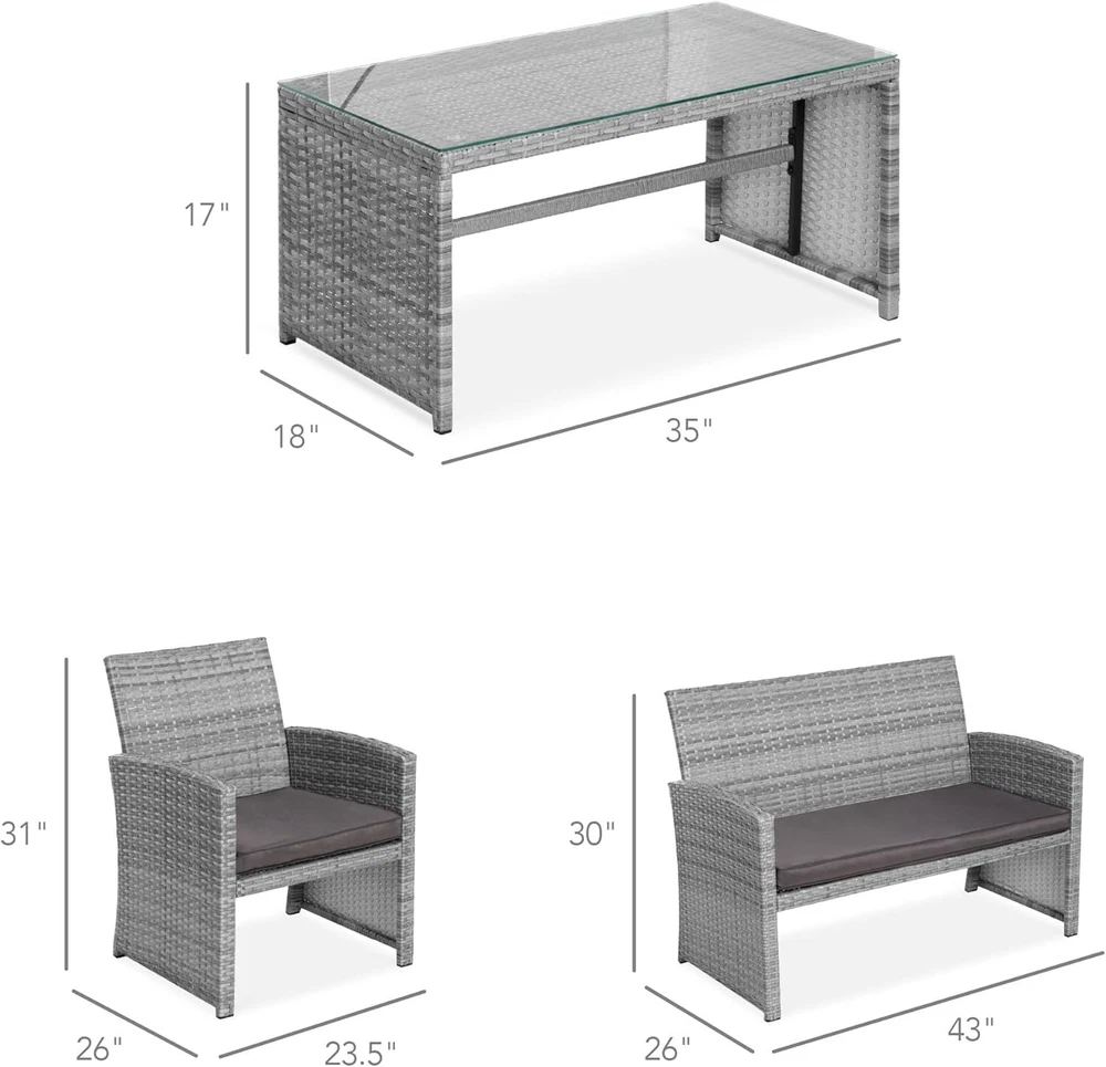 Enhance your outdoor living space with this versatile 4-piece modular furniture set, which includes a double sofa, two chairs, and a coffee table, providing comfortable seating for four. Crafted with all-weather wicker handwoven over a durable steel frame, this set ensures lasting durability. The included weather-resistant cushions are designed to prevent fading and wear from wind and rain, and their removable, machine-washable covers make maintenance a breeze. The wicker coffee table features a removable tempered glass top, offering a smooth and sturdy surface for your food and drinks. This set is an excellent addition to any backyard, balcony, patio, or other outdoor sitting area. Dimensions: Double Sofa: 43 inches (L) x 26 inches (W) x 30 inches (H) Chair (each): 26 inches (L) x 23.5 inches (W) x 31 inches (H) Coffee Table: 35 inches (L) x 18 inches (W) x 17 inches (H) This modular design allows you to mix and match the pieces to suit your space, making it a practical and stylish choice for enhancing your outdoor relaxation and entertainment areas.