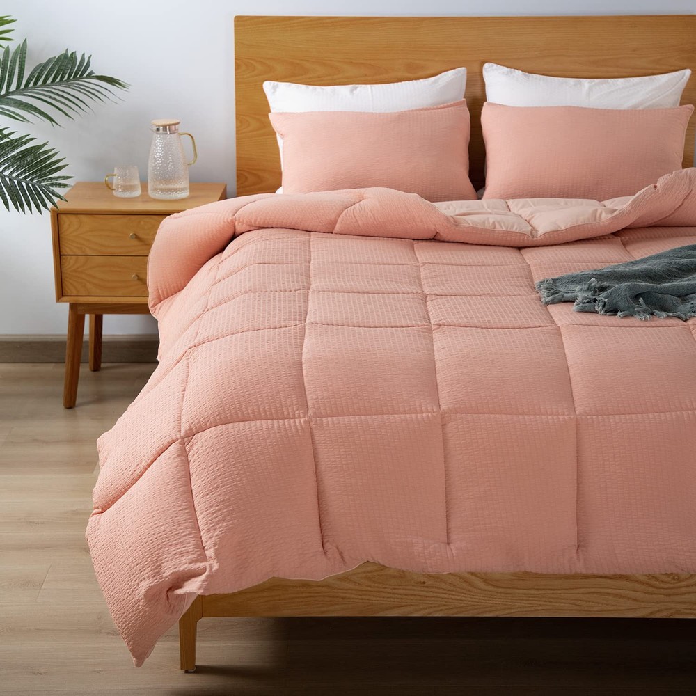 Add the right amount of warmth and color to your bedroom with seersucker Comforter Set. This comforter set is not only super soft and cozy, but also textured. With a classic design and contemporary panache, you can never go wrong to dress up your bed that keeps the style modern but with a perfect traditional touch. The matching pillow shams to complete the styling of a beautiful bedroom. With hydrophilic fill and floating foam, it retains the fluffiness to keep the look infinitely soft and alluring. Box-stitched duvet filled material that does not shift or clump. 3D hollow staple down alternative fiber provides firmness and durability. A reversible look makes it extremely convenient to use the comforter longer by just merely flipping it. Come home to a well-designed bedroom bursting with charm. The comforter set comes in a highly protective vacuum sealed plastic zipper bag packaging to freshly preserve and protect it from external elements dust, moisture; perfect for gifting and storage. Once opened, we suggest for a quick fluff to revive comforter's original loft. Please note: Our images of the product display its true color as much as possible; however, the color may appear brighter due to professional lighting and setting. Also, please note that colors can vary person to person and can look different on each owns' computer/mobile screen due to brightness, contrast, hues, saturation, resolution. Available in Twin/Twin Xl Set, Full/ Queen Set and King Set and each size with filling weight options, All season and winter weight. Year Round Seersucker Comforter Set - King set includes 104*90 inches comforter and 21*37 inches standard sham. Classic & Elegant Decoration - Seersucker comforter set features a seersucker stripe detail, with a fashionable and avant-garde sense. All-season bedding sets create an elegant and tranquil atmosphere while also providing breathable and comfort. Cozy & Shaggy Comforter - The front of the Comforter is designed as seersucker with a stereoscopic bumpy feel, and the back is made of microfiber. The All Season Comforter is filled with 260gsm Special 3D hollow staple down alternative fiber provides firmness and durability. Induced with unique foam with ability to float in water makes the comforter extremely comfortable to get the most invigorating sleep. Machine washable – this comforter comes with hydrophilic fiberfill which makes it machine washable & easy to maintain. It's also moisture absorbent & retains the fluffiness of the comforter. *Machine wash cold, do not bleach, do not iron, do not wring dry; tumble dry low. * vacuum sealed package to freshly preserve and protect it from external elements dust, moisture; perfect for gifting and storage. Once opened, we suggest for a quick fluff to revive comforter's original loft. PERFECT GIFT: For family & friends, the beautiful design is crafted with thought and care. Our vacuum sealed packaging makes it perfect for the holidays and all special occasions.