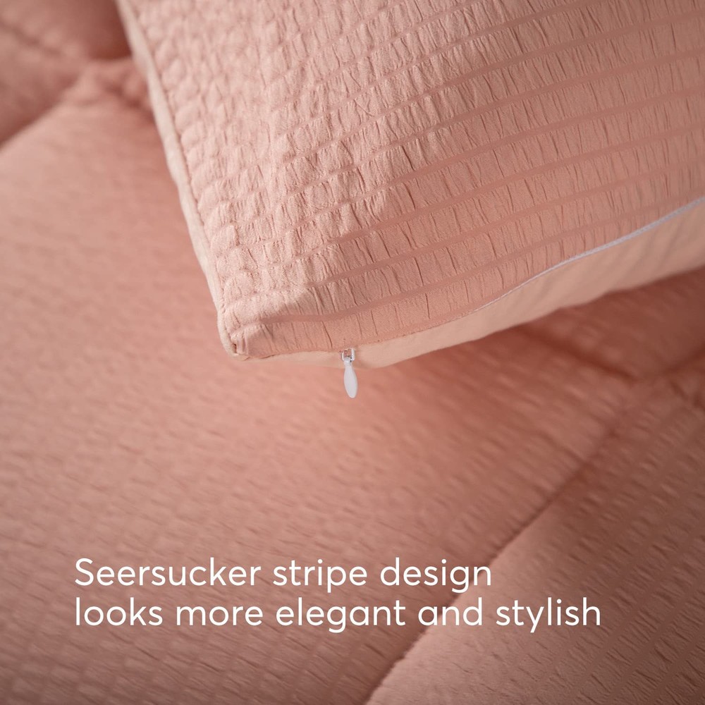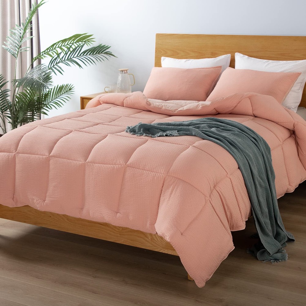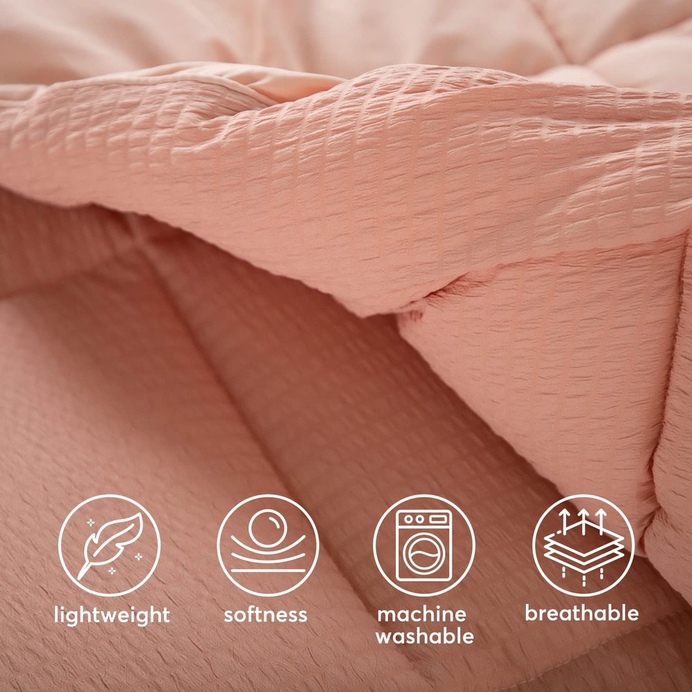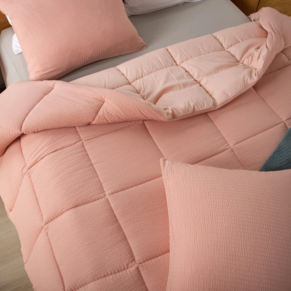 1. This comforter set is perfect for year-round comfort! The seersucker texture adds a stylish touch while staying incredibly soft and cozy. I love how the box stitching keeps it fluffy without shifting, and the matching pillow shams complete the polished look. The lightweight warmth is just right—great quality for the price. My bedroom feels so inviting now!
