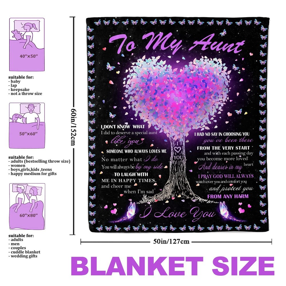 We offer Free Shipping on all order!! Welcome to my stores, The Smart of your choice and satisfaction guarantee. Mothers Day Aunt Gifts Blanket, Auntie Gifts Ideas, Aunt Birthday Gifts from Niece, Aunt Ever Gifts, Gifts for Aunts from Niece, Birthday Gifts for Aunt, to My Aunt Throw Blanket 60"X50" Product Description 【GIFT FOR AUNT】Our Ultra-Soft Blanket Is Designed with Thoughtful Gifts for Aunt. Aunt Birthday Gifts from Niece, Aunt Mother's Day Gifts, Aunt Ever Gifts, You’ll Be Proud to Give the Luxurious Gift Blanket to Telling Her How Much Do You Love and She’ll Cherish It Forever 【SOFT MATERIAL】50”X60” Throw Blanket Is Made of Premium Fabric Flannel, Is Lightweight and Breathable, Has Plush Coziness and Won't Pill and Wrinkle. The Cozy High-Quality Auntie Blanket Is a Big Warm Hug, Super Soft to the Touch with Skin-Friendly and Fluffy 【AUNTIE BLANKET WITH LOVE WORDS】Our Auntie Ever Gifts Blanket In 3D Print with Love Tree and Wonderful Words All over It Expressing Appreciate, Love, and Affirmation. Nothing Can Move People More Words, The Warmth of Blanket Will Reminder Aunt of a Positive Sense of Well-Being 【OCCASIONS】To My Aunt Blanket Is Suitable For All Seasons, Used for Bed Blanket, Travel Blanket, Car Blanket, Picnic Blanket, Outdoor Blankets, and Living Room Sofa Blanket, Party Decoration, Etc. This Fuzzy Blanket Can Bring Relax and Comfort 【EASY CARE AND CLEAN】 This Durable Flannel Blanket Is Made of Non-Shrink Fabric Can Machine Wash and Is Easy to Dry, Won't Fade, But You Should Notice that Don’t Use Bleach and Iron The Aunt Blanket Gifts With Meaningful Words To Warm Her Heart, Imagine How Surprised She Would Be When She Received The Aunt Gifts From Nieces Or Nephews UNIQUE GIFT FOR AUNT BLANKET A Cozy Throw Blanket Filled with Words of Love and Gratitude In Luxurious Comfort and a Beautiful Design If You Got The Aunt Ever, She Deserves A Perfect Present A Love Tree Means that I Will Always Protect My Aunt a Big Tree, Which Will Make Her Wrapped with Love WASHING TIPS Please Wash Our Blanket with Cold Water on A Gentle Cycle Separately, Dry It on Gentle Cycle with Cozy Temperature If You Have any Questions, Please Feel Free to Contact Us, We Are Happy to Serve You PRODUCT DETAILS Product Size: 50"X60" Inches Material: Soft Flannel, Warm And Comfortable Without Pilling Printing: 3D Printing, The Pattern Is Exquisite And Clear Packing List: Flannel Blanket X 1 Occasion: Mother's Day, Valentine's Day, Christmas, Home Decoration, Halloween, Family Holiday, Also as Photography Prop Payment Policy - Payment managed by eBay. Shipping Policy - We do not ship to a different address. we will ship to the address you provide on the ebay only. Please check your address before purchase. - Items are dispatched within 24 hours (except weekends and holidays) and shipped from US. - It should take 3-5 business days for the product to reach your destination (Saturday and Sunday excluded). - We use a selection of shipping services such as UPS, FedEx, USPS etc. - We ship only to the 48 contiguous states of America. We do not ship to Hawaii, Porto Rico, Alaska, US Protectorates, APO/FPO addresses and PO Boxes. Local pickups are not offered. - If it takes any longer than that, please do not hesitate to contact us to resolve the issues. Returns Policy - This product comes with 30-Days Money Back Guarantee. - If you receive an item and it doesn't work properly or you don't like it because of any reason at all, - We have a 100% refund/return policy. We will ship you a new item or refund your money for the full sale amount. - For all returned products, buyers MUST contact us for the returning address.