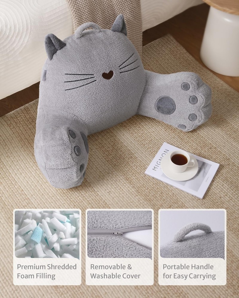 Blissful Diary Kitty Reading Pillow for Kids/Teens/Adults, Back Rest Pillow for Sitting Up in Bed with Shredded Memory Foam, Includes Arms and Washable Cover, Light Gray Customizable Comfort: Filled with premium shredded foam, this backrest pillow contours to your back, arms, and waist for superior support while you read, watch TV, gaming or work on your laptop. Adjust the firmness easily by removing foam through the bottom zipper Adorable and Functional: The Blissful Diary Kitty Reading Pillow features an adorable cat design that adds a playful and whimsy touch to any room. Covered with plush, luxurious fabric, this back pillow for bed sitting up offers irresistible comfort and support Easy to Clean: The removable cover of the Kitty Reading Pillow is machine washable, making it easy to keep your back support pillow looking and feeling fresh. When enjoying snacks and drinks with the reading pillow you don't need to worry about stains Portable Design: With a convenient carry handle on the top, you can easily carry your back support pillow from room to room. Perfect for use in the bedroom, living room, balcony, or even on the floor, this pillow is a versatile addition to your home Gift Idea: The Kitty Reading Pillow is an ideal gift for kids and adults alike. It will be a thoughtful present for birthdays, holidays, or any special occasion, to make comfort and delight for all in daily life