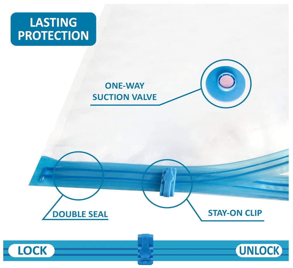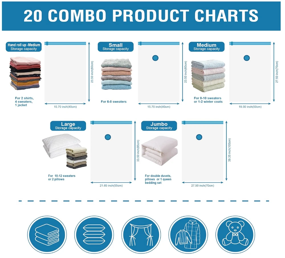 About this item Expand your storage by up to 80%: Our vacuum seal storage bags effortlessly compress clothes, blankets, pillows, and travel essentials in seconds, transforming overcrowded closets and overpacked suitcases into clean, organized space- no clutter at home, no unnecessary luggage fees. Just more room whenever you need it. Reliable protection: Engineered with a triple-seal turbo valve and double-zip seal to maintain a lasting compression. Locks air out to protect against dirt, dust, and damage while preventing unwanted rebound.Can be used repeatedly. 20 combo includes: 4 Jumbo: 39.35” X 27.5”(100cm X 70cm); 4 Large: 33.5” X 21.65”(85cm X 55cm); 4 Medium: 27.5”X 19.5”(70cm X 50cm); 4 Small: 23.5”X 15.7” (60cm X 40cm); 4 Travel Roll Up (No pump needed): 23.5”X 15.7” (60cm X 40cm) Easy compression: Compatible with standard vacuum cleaners for rapid air removal. Includes a portable hand pump for convenient, cordless compression at home or while traveling. Multi-Use for Travel & Home: These vacuum seal storage bags are designed to expand luggage capacity and simplify home organization. Designed for home storage, travel, flights, cruises, moving, and seasonal storage. Made for families, students, and frequent travelers who need more room without extra bulk. FREE FAST SHIPPING