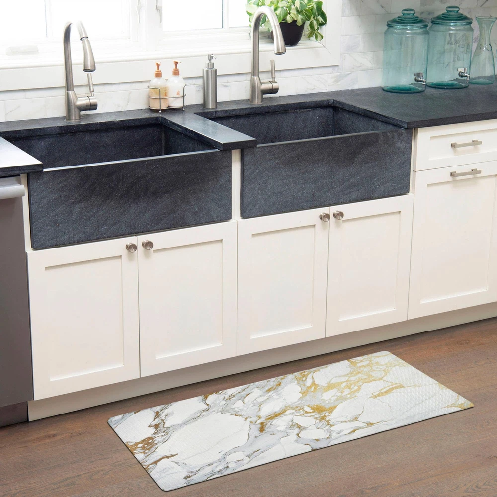 Enhance your kitchen with comfort and style with anti-fatigue Cozy Living Classic Marble Kitchen Mat by SoHome. With a classic marble design, these kitchen mats will bring an elegant style into your space. These kitchen mats are finished with a beautifully embossed textured top that is appealing to the eye, making these mats both fashionable and functional. Constructed with a smooth beveled edge and durable polyvinyl foam that provides a safe anti-slip surface for a safe step. CLASSIC TOUCH: With a classic marble design, this kitchen mat will bring effortless style into your space. DIMENSIONS: Measuring 17.5" W x 55" L, this generously sized mat offers a great amount of space for your comfort needs. FUNCTIONAL AND SAFE: These functional kitchen mats provide a non-skid, non-slip and anti-trip surface for safety and on any flat surface such as tile, hardwood, or concrete ULTIMATE COMFORT: The polyvinyl foam construction makes these super soft and provide added support for your back, neck and feet while you are cooking, cleaning or doing your laundry. Product Note:Rugs may contain temporary creases upon arrival, allow time for creases to flatten and settle