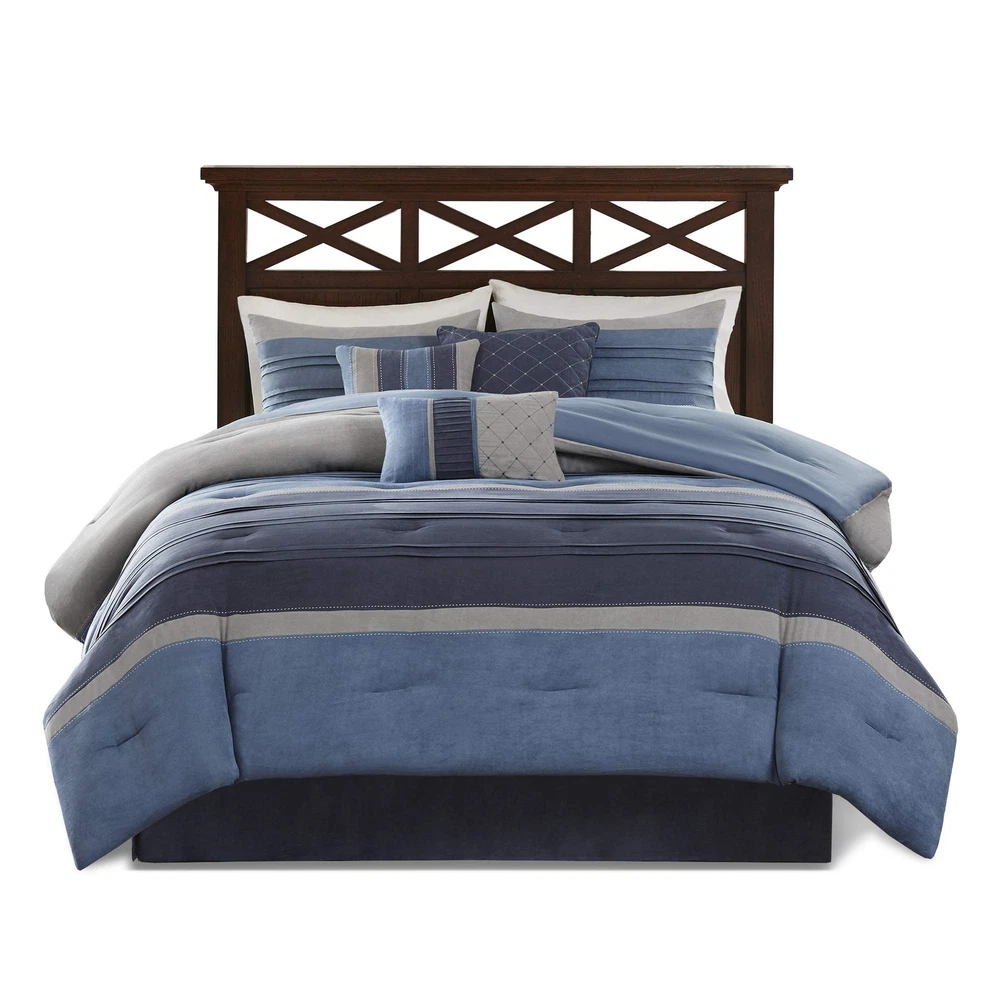 Create a warm update to your space with the Collins Collection. This pieced suede comforter features shades of navy, medium blue and grey along with pleating for the perfect balance in this collection. Three decorative pillows use quilting and piecing for the perfect finishing touches to this set. Create a warm update to your space with the Collins Collection. This pieced suede comforter features shades of navy, medium blue and grey along with pleating for the perfect balance in this collection. Three decorative pillows use quilting and piecing for the perfect finishing touches to this set. Set includes King comforter (104x92), 2 King shams (20x36), bedskirt 78x80 with 15-inch drop, and three decorative pillows 18x18, 16x16, 12x18 SIMPLICITY & CONTEMPORARY - soothing and calming colors in pleating treatment. Unisex bedding for everyone BEAUTIFUL accessories - fabric manipulation of pleating and stitching to create 2 square decorative pillows and 1 oblong pillow for top of the bed HYPOALLERGENIC - polyester filling in comforter and decorative pillows Machine washable for easy care