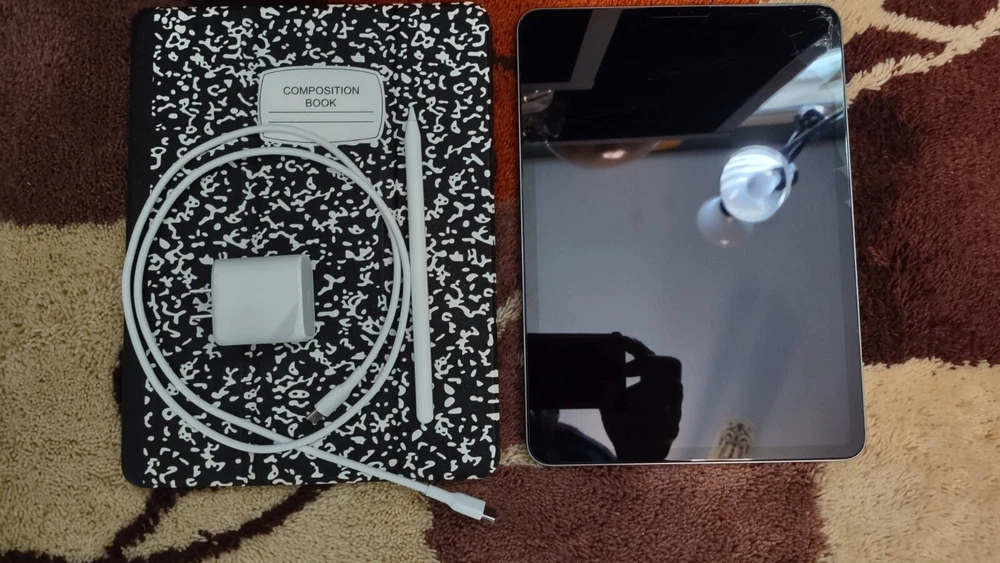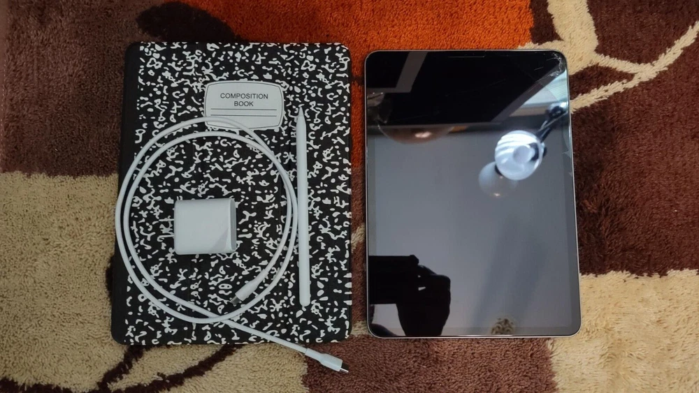 The iPad works as should (audio/wi-fi/bluetooth/front and rear camera/touch screen operation/apple pencil gliding); but the screen is cracked. The rest of the iPad's body is imperfection-free. You will receive the 4th gen iPad pro, 2nd gen Apple pencil, the power/sync cord, 20w power adapter, and the 'composition book' ipad case. A glass screen protector has been installed over the cracked screen. Battery life is great. Apple 2nd Generation pencil works as should;and the battery life is also, great. No box is included, sorry.