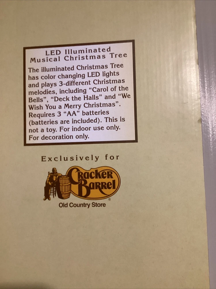 Cracker Barrel LED IIIuminated Musical Christmas Tree 18” Tree Plays three different Christmas melodies. Requires three (3) “AA” size batteries (not included). Tested and working- excellent condition.
