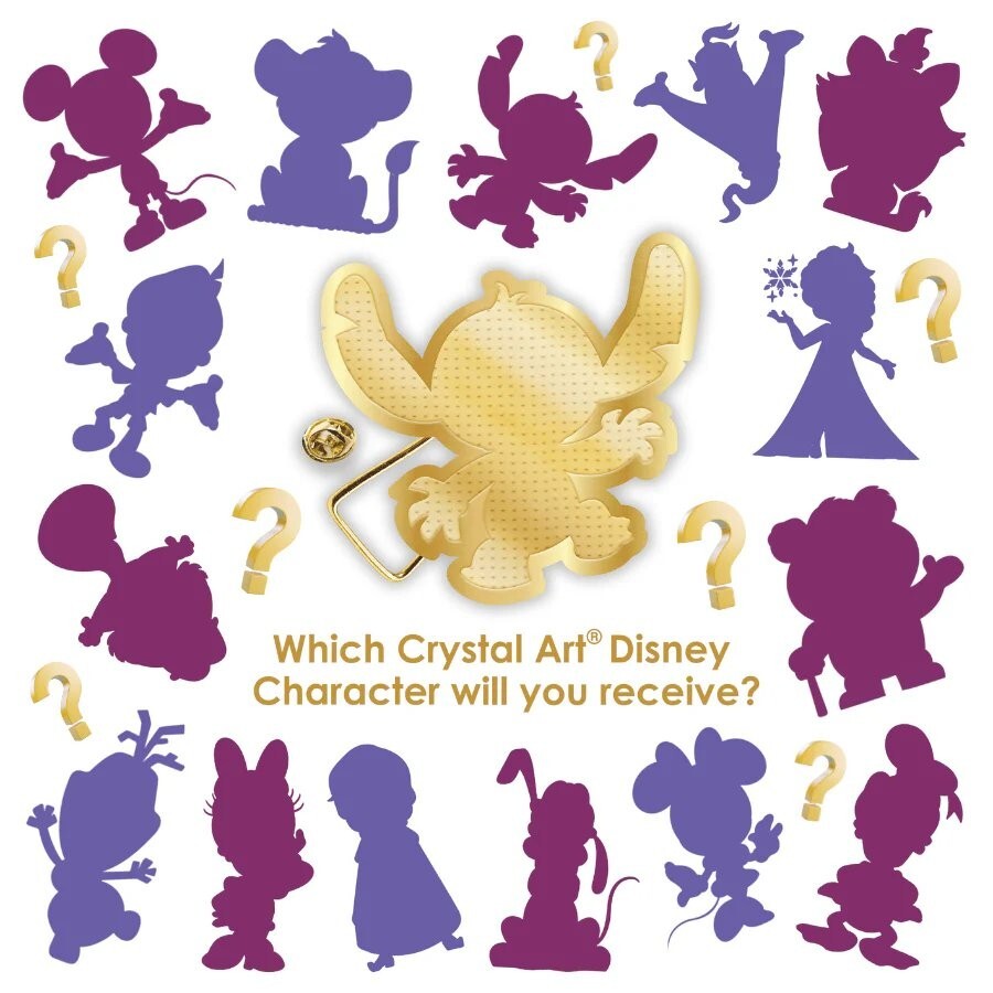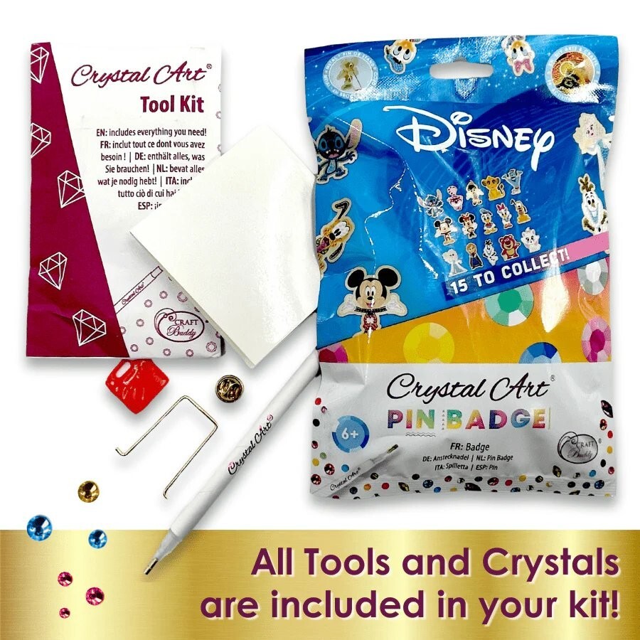 Craft Buddy Disney 100 Years of Wonder Crystal Art Pin Badge Which Character Will You Receive? Add flair to your jackets, hats, bags and accessories with the highly collectible Disney Crystal Art® Pin Badges. This set of fifteen characters are from some of the most well-loved animated Walt Disney movies, and are sure to become the most sought-after Crystal Art collectables. Created by Craft Buddy, each DIY Craft Kit 'surprise' will come from the magical world of Walt Disney, from recent franchises such as The Lion King, Toy Story and Frozen, and our nostalgic friends like Mickey and Donald! Each 'mini-kit' comes with all the tools and accessories you need to complete your badge, and are made out of sturdy golden zinc-alloy. Simply reveal the adhesive template, add your glimmering gems to the coded spaces, and choose your backing. Once you have finished embellishing your Pin Badge, you can combine crafting with fashion, and secure on clothing via two pins with secure clasps. If you want to display on a desk or shelf, each pin comes with a unique 'strut stand', allowing the badge to stand freely. The exciting feature of the Disney Crystal Art® Pin Badges, is that each pack will reveal a complete surprise - in the form of a 'Blind Bag'. When you purchase your pack, it will be a secret which wonderful character you have received! Why not grab a selection of these shimmering stocking-fillers and share with friends, at a party or special occasion, as a 'lucky-dip adventure'! Why not try and collect them all, and be the envy of friends and family! However you choose to collect and create, the Disney Crystal Art® Pin Badges are sure to take the Diamond Painting world by storm! Product Breakdown: 1 x Metal Pin Badge with Adhesive Template 1 x Detachable Metal Badge Stand 2 x Removable Pin Backs 1 x Sealed Paper Wallet with Tool Kit 1 x Pick Up Tool 1 x Jelly Wax Bags of Coded Crystals Ziplock bags for spare Crystals