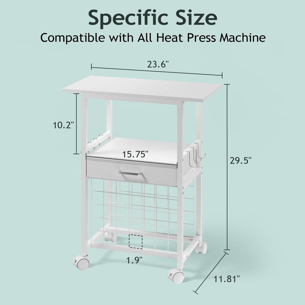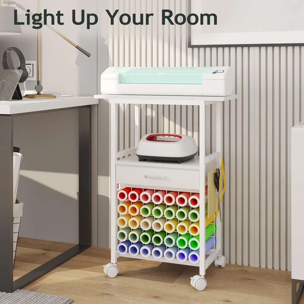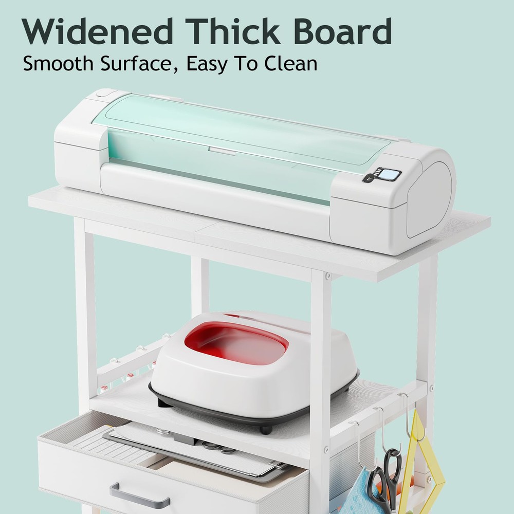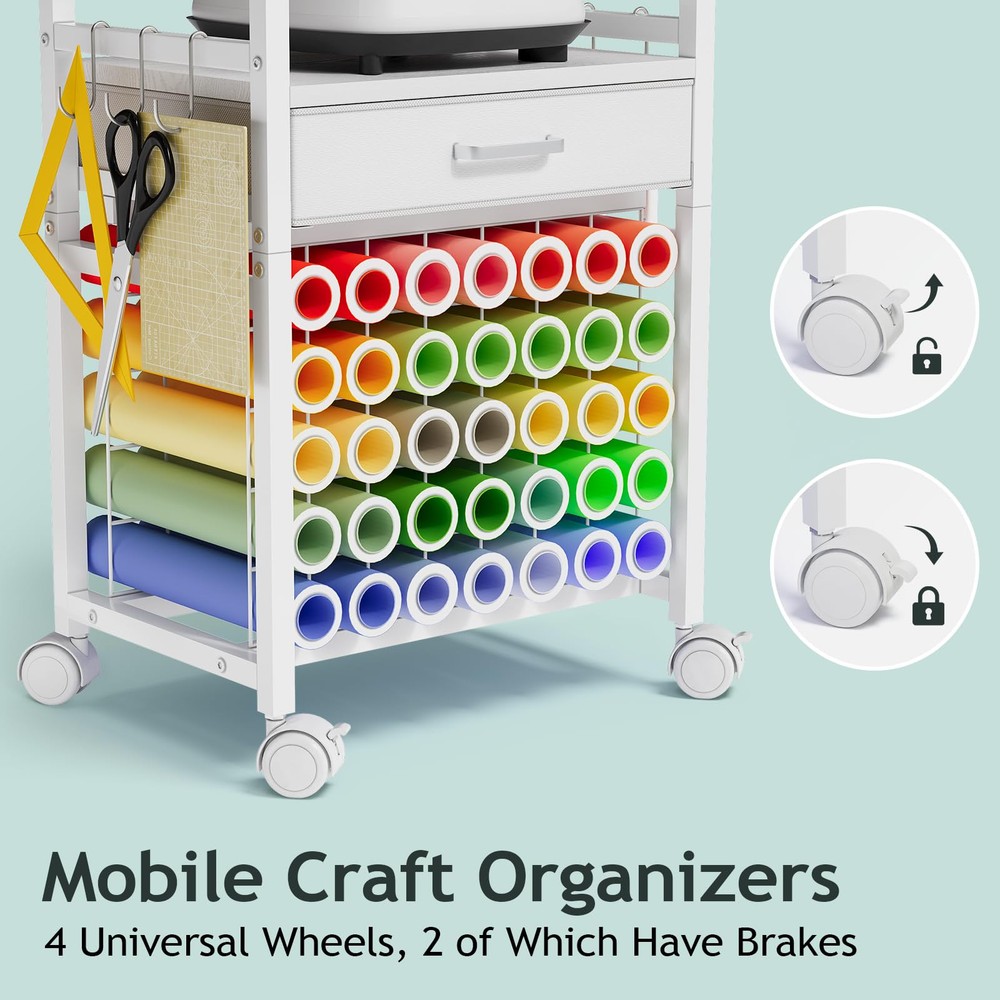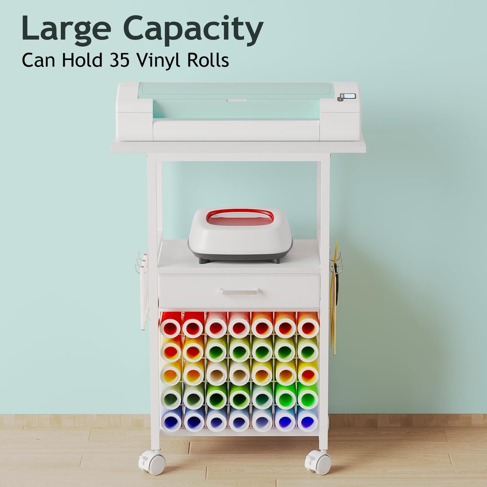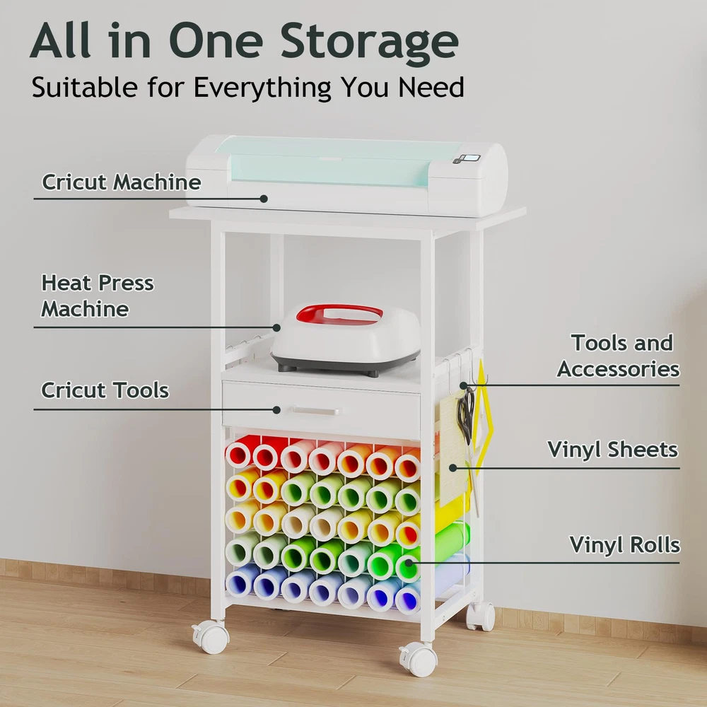 [All-in-One Craft Cart] Keep your workspace tidy with the Craft Cart Organizer Table, featuring a fabric drawer, 6 side hooks, and a bottom vinyl storage rack that holds up to 35 rolls. This multifunctional rolling storage cart is perfect for organizing tools, materials, and accessories in one convenient place. [Versatile Storage Options] With a spacious middle shelf for card stock and supplies, plus side hooks for hanging scissors or craft mats, this cart is designed for diverse needs. Ideal for craft room storage, offering both vertical and horizontal organization. [Compact & Space-Saving] Measuring L23.6" x D11.81" x H29.5", this crafting cabinet workstation tool fits snugly into small spaces while providing ample storage for all your supplies. Maximize your workspace without compromising on functionality. The top shelf is compatible with all Cricut machines, including Cricut Maker, Cricut Maker 3, Cricut Explore Air 2, Cricut Explore 3, Cricut Joy, EasyPress Mini, EasyPress 2, Silhouette Cameo series, and more. [Smooth Rolling with Stability] Equipped with four 360° rotating wheels, including two locking brakes, this craft table is easy to move and stays firmly in place during use. Perfect for multi-room crafting or for flexible positioning in your workspace. [Heavy-Duty Durability] Constructed from premium materials, this crafting cabinet workstation tool supports up to 110 lbs without wobbling, making it suitable for holding a vinyl storage compatible with Cricut or other heavy crafting machines. [User-Friendly Design] The top shelf is spacious enough to hold a craft machine, while the middle and lower shelves provide room for vinyl rolls, card stock, and other supplies. A must-have for crafting enthusiasts who value craft organizers and storage. [Easy Assembly for Convenience] Simplify setup with the included detailed manual, allowing you to assemble the craft room storage cart in minutes. Spend less time building and more time creating! [Creative Workstation for DIY Projects] Designed for hobbyists and professionals alike, this craft table streamlines your crafting workflow, providing easy access to tools and materials. Say goodbye to clutter and hello to creativity. [Sleek & Modern Design] Finished in a clean white color, this cart complements any home décor style. Perfect for enhancing the aesthetics of your craft room storage while providing functional organization. [Perfect for Vinyl Enthusiasts] The built-in vinyl roll organizer accommodates up to 35 rolls, keeping them neat, accessible, and protected from damage. Whether you’re cutting, weeding, or creating, this vinyl storage compatible with Cricut ensures your supplies are always ready to use.