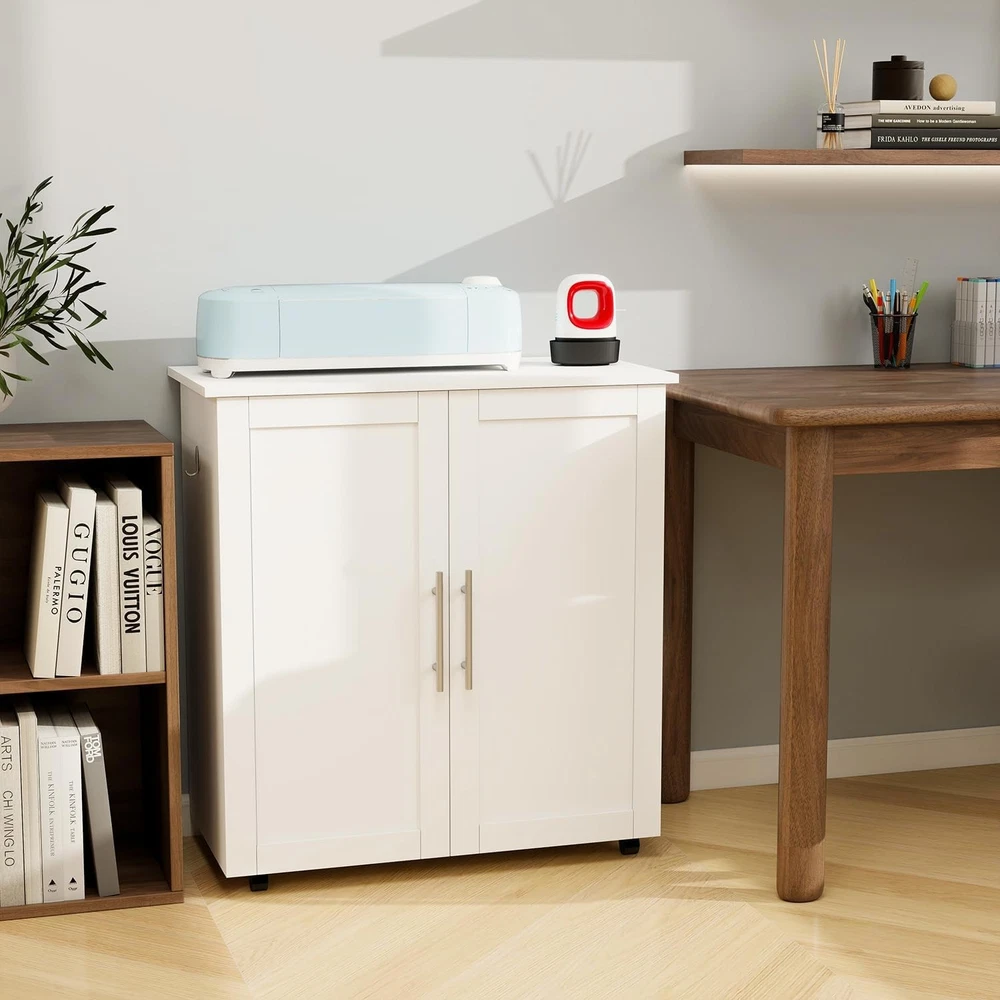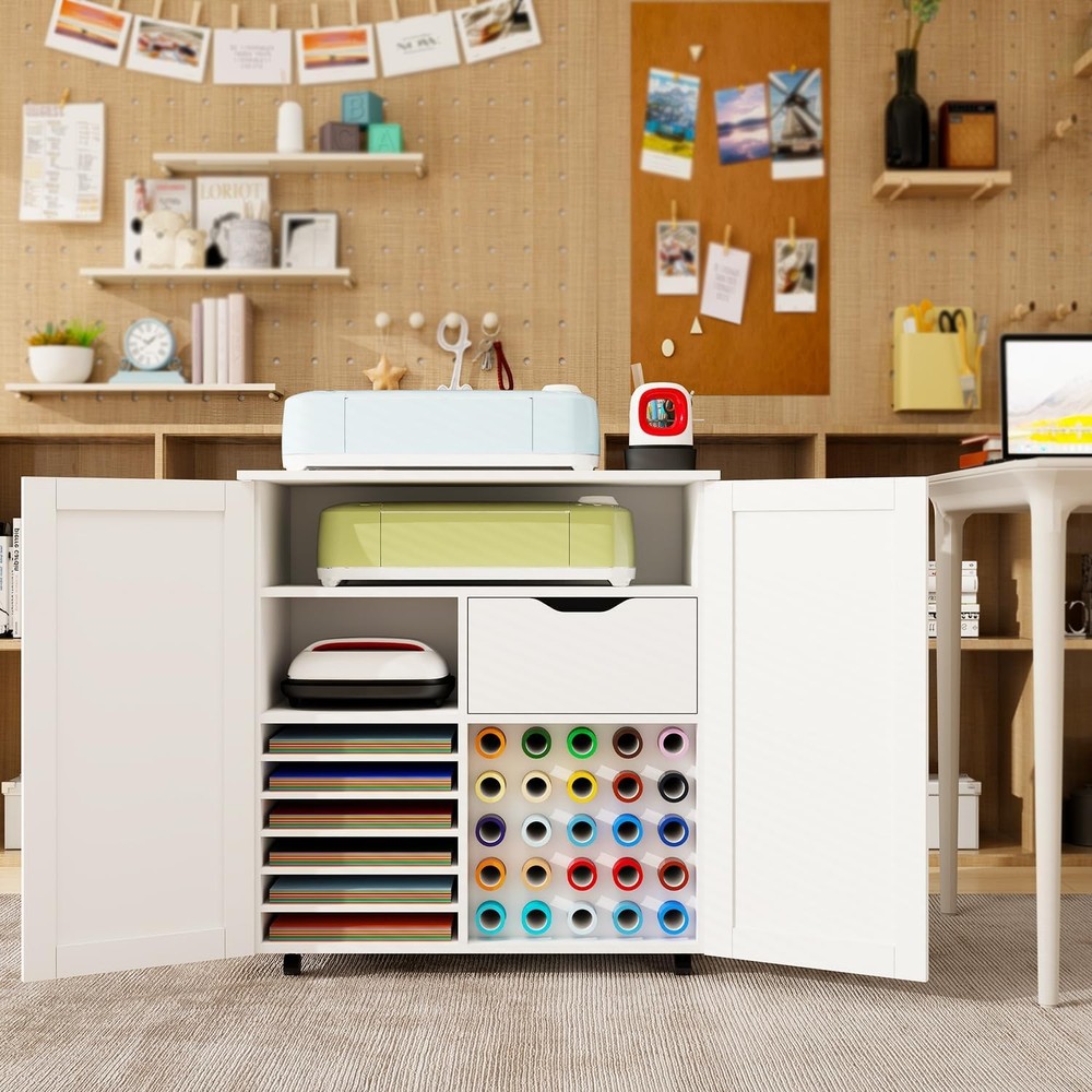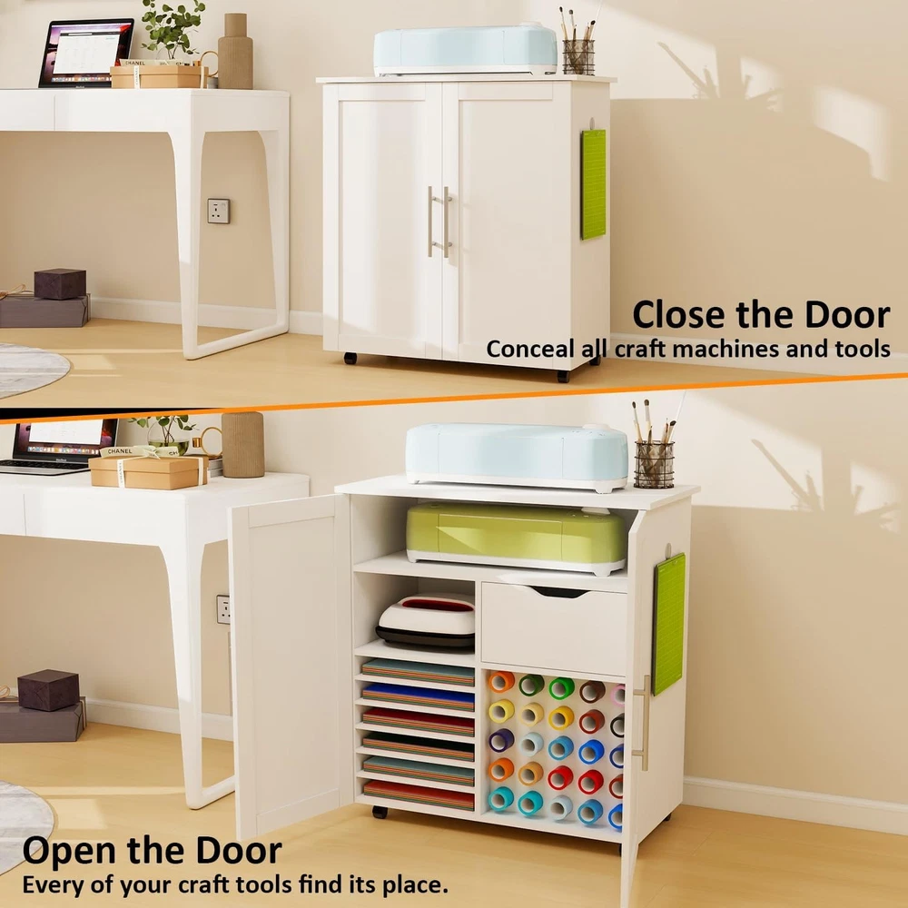 Product Description About this item 【UPDATED BIG SIZE CABINET】- 31.6”L * 15.8”W * 33.7”H; No Squeeze. 【HIDDEN STORAGE, FASHIONABLE CABINET FOR CRICUT】 - Conceals all of the Crafting tools and Materials (for Cricut maker, Vinyl Paper, Heat press etc) when closed, make everything Clean and Tidy and Dust-Free. Double Magnetic Door Design to reach anything you need inside. Nice decor decoration, no one knows it is a cabinet cart for Cricut. 【ULTIMATE STORAGE PLACE, 4 LAYERS 】 - Lots of Storage: ①Top Layer: Super big folding up desktop(31.6” L*15.8” W) for Cricut Machine, Hot Press Machines, Printers + ②Layer 2: Middle Shelf compartment(28.7”L*7.1” H*14”D): to hold spear machines or printers or crochet + ③Layer 3: 1 cabinet(13” L*7.8”H*14”D)for heat press and 1 deep wooden drawer(15.2”L*7.8”H*14”D) for crafting tools and accessories + ④Layer 4: Adjustable Shelves(5shevles adjustable) for Card stock and 12*12 Vinyl Paper, 25 Vinyl Roller Holders. Everything can find its own space. 【2PCS METAL HOOKS, SUPER STRONG】- 2pcs Metal Hooks Secured with Screws(No Plastic Hook, No Glue) for your Ironing Pads and other hanging ITEMS, super strong. 【ROLLING & MOVABLE CARFT CART 】- This Rolling Cart Cabinet for Cricut is a cute rolling craft station and it rolls with 4 wheels 360° rotation and 2 of the wheels are lockable. You can push your for cricut around the room when you work and make it stop anytime. 【UNIVERSAL COMPATIBILITY 】- This Foldable craft Table cart is compatible with all for Cricut machines and Silhouette Cameo series. Such as Cameo 4, for Cricut Maker 3, for Cricut Maker, for Cricut Explore Air 2, for Cricut Explore 3, for Cricut Joy, for Cricut Easy Press Mini, and for Cricut EasyPress 2, etc. [CLEAR DETAILED INSTRUCTION, EASY ASSEMBLE] - This Craft Cart Cabinet Tables are with clear and detailed Step by Step instruction. All parts and accessories can be easily identified with Stickers for easy recognition. 【MOST THOUGHTFUL GIFT】 - Warm Her with a luxury Craft Cart Table - This gift will help her expose her innovation when doing Crafts. So Get this Craft Cart Table as gift for her for Christmas, New Year, Anniversary, Birthday, for Congratulatory Gift or Good Report Card Gift. Organize & Decorate your Craft Room with a Craft Cart Cabinet! Craft Storage Cabinet for Cricut, Concealed Storage. Big Size - 31.6"W x 15.8"D x 33.7"H, No Squeeze. Plenty of Storage - 4 Layers Storage, Big Desk Top, Deep Drawer, Adjustable Shelves, Vinyl Holders. Rolling and Movable - Lockable Wheels , Push and Stop the table freely. Closed as Fashion Cabinet, Open as big Craft Work Station. Close to conceal all of the storage, Open to easily find out all of your craft Stroage. A Nice Home Decor to Decorate your Craft room, studio apartment, Sewing Room, Cloffice. 4 Layers Big Storage- All the machines(Joy,heat press,Cricut Maker) & accessories accomadated. Ultimate Storage for all Craft Tools. Big Compartments and Deep Drawers. 2nd layer Compartment for: spear circut machines or Heat press or Easy press machines. 3nd layer left compartment: For Heat Press. 3nd Layer deep drawer size:15.2”L*7.8”H*14”D for crafting tools and accessories. Adjustable Shelves and 25 Vinyl Holders. 25 Vinyl Holders to hold scrap paper, vinyl paper, Vinyl Rollers, for 12*12 Vinyl Paper, No need squeeze.. Layer Distance adjustable by putting in or taking off the layer table according to your need. 25 Vinyl Holders. Metal Strong Hook and Movable Wheels. Metal Hook, Screwed in to hang. 2pcs Strong Metal Clips to Screw in the side board of the Cabinet. Strong hanging power for Ironing Pad. Fast moving and locking wheels. 4 Rolling Wheels(2 of the wheels lockable) , 360 degree Rotation. You can push your cart around the room freely. Keep your Craft Room Organized and Tidy! Say Goodbye to "Clutter" & " Messy", to more organized and tidy! Decorate your Craft Room, Dinning Room, Study Room. Extra large size for storing a variety of devices. Desk Top - Big Work Station: 31.6” L*15.8” W. 2nd Layer: Middle Shelf compartment(28.7”L*7.1” H*14”D). Layer 3: 1 cabinet(13” L*7.7”H*14”D) for heat press and 1 deep wooden drawer(15.2”L*7.8”H*14”D). Versatile usage: For Cricut Table, works as a heat press table, printer stand, sewing cart, gift wrap cart, or daily storage cabinet. Best Gift Idea -for crafters, hobbyists, DIY Lovers. Great gift for birthdays, holidays, Christmas, and Thanksgiving for her/him, family, and friends. On Aug 6, 2025 at 20:47:20 PDT, seller added the following information: