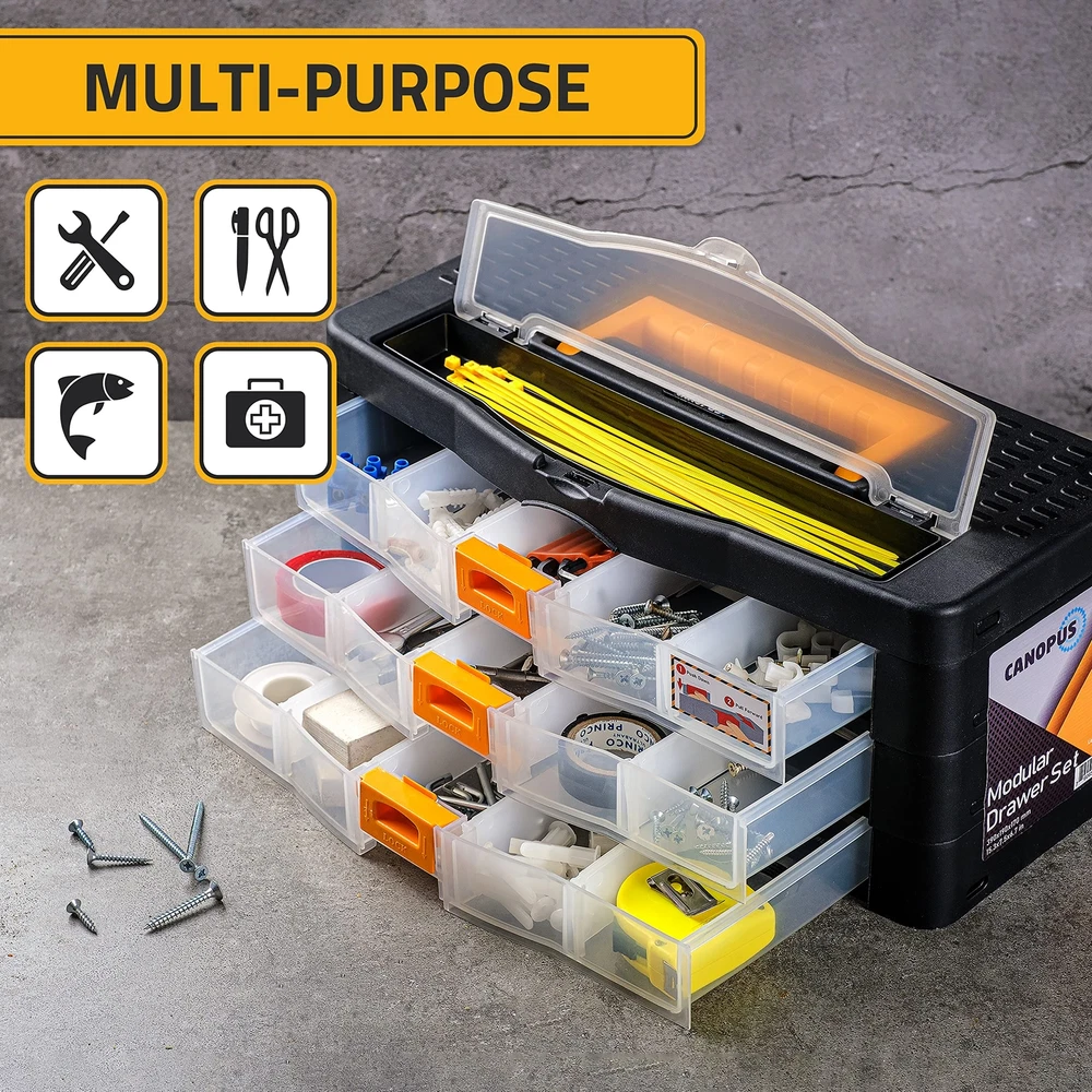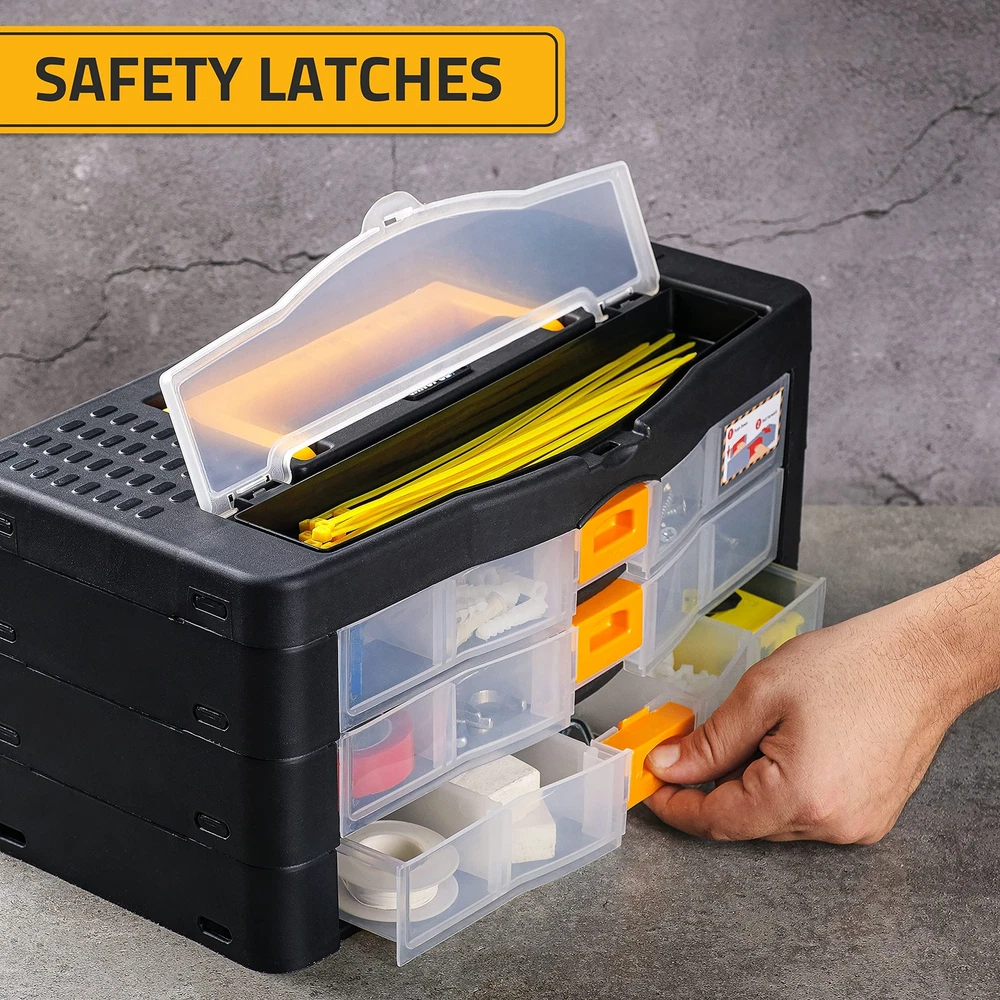 Craft Organizer with Drawers: Specially designed and Ideal for storing and carrying tools and craft items, this portable plastic toolbox has an impact-resistant construction of great value. The size of this craft organizer is ideal and will take the optimal room in your work cabin or closet. Nice Quality and Durable: Constructed from durable, high-impact polypropylene, this case will be your favorite and long-lasting option for all your storage needs. The transparency of the drawers provides great convenience for the visibility of the contents of each drawer. Sturdy and Portable: With its convenient carrying handle, this organizer is easily portable and travel-friendly. Just take it whenever and wherever it is needed. An extra compartment on the top part is also maximizing its storage capacity. Multi-Purpose Functionality: This excellent multi-purpose storage case is perfect for everything from small tools and hardware such as nails, screws, pins, and bolts, to fishing tackle, beads, jewelry, and crafting material! It is simply the master key solution for all storage problems.