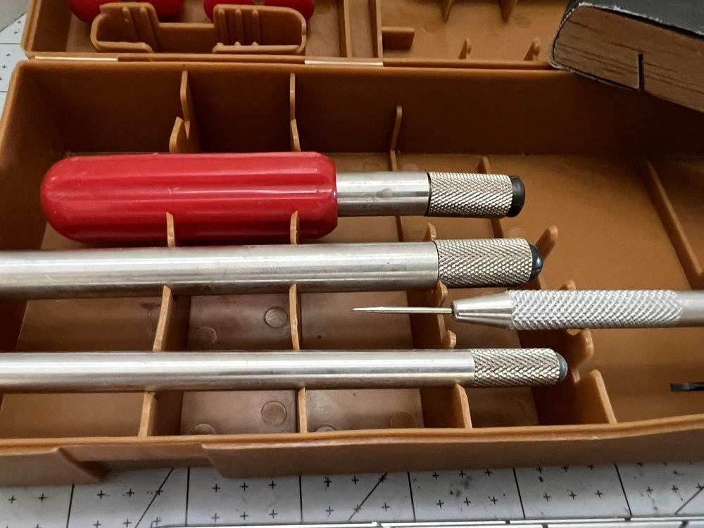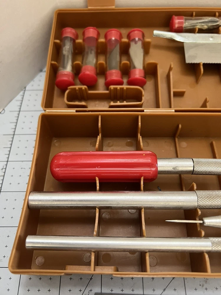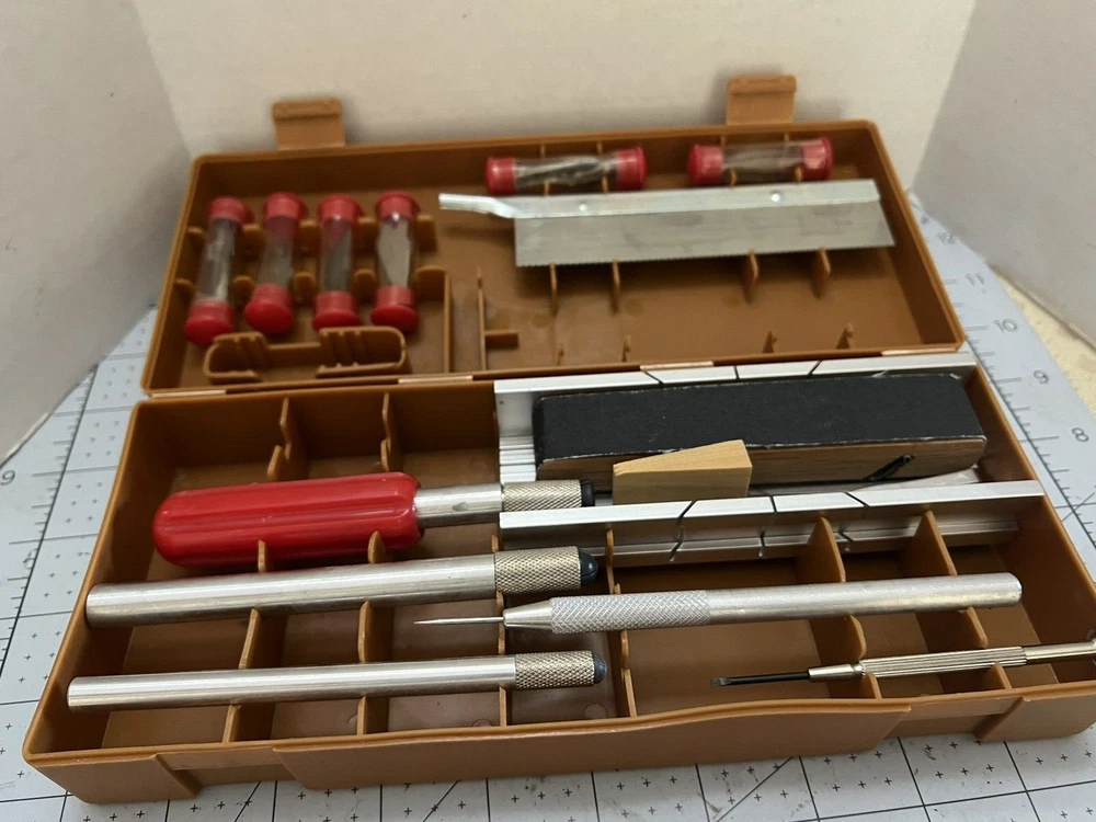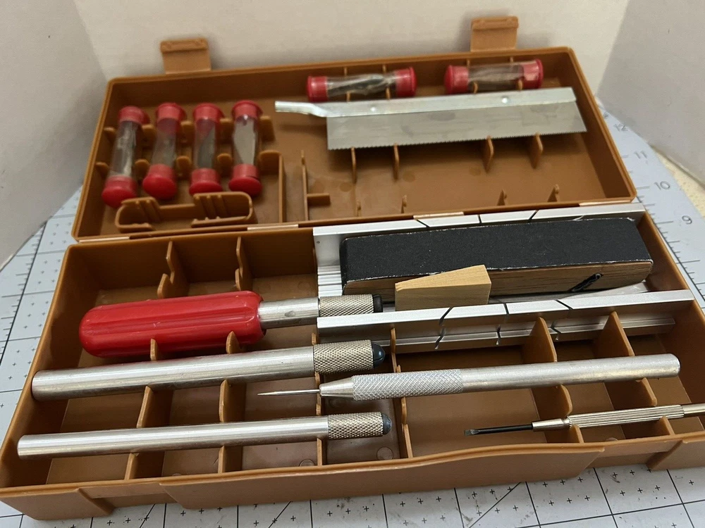 Craft tools- Offered in original plastic case is a Craft tool set. Includes numerous type blades, a miter box, saw, tweezers, 4 tool holders, screwdriver & sanding block. Look to have never been used . No maker name. A super clean set. Please view photos for what is included carefully they are part of the description. ruler or chart not included, only to show size of item. Please feel free to contact me for multiple purchases FOR shipping discounts!