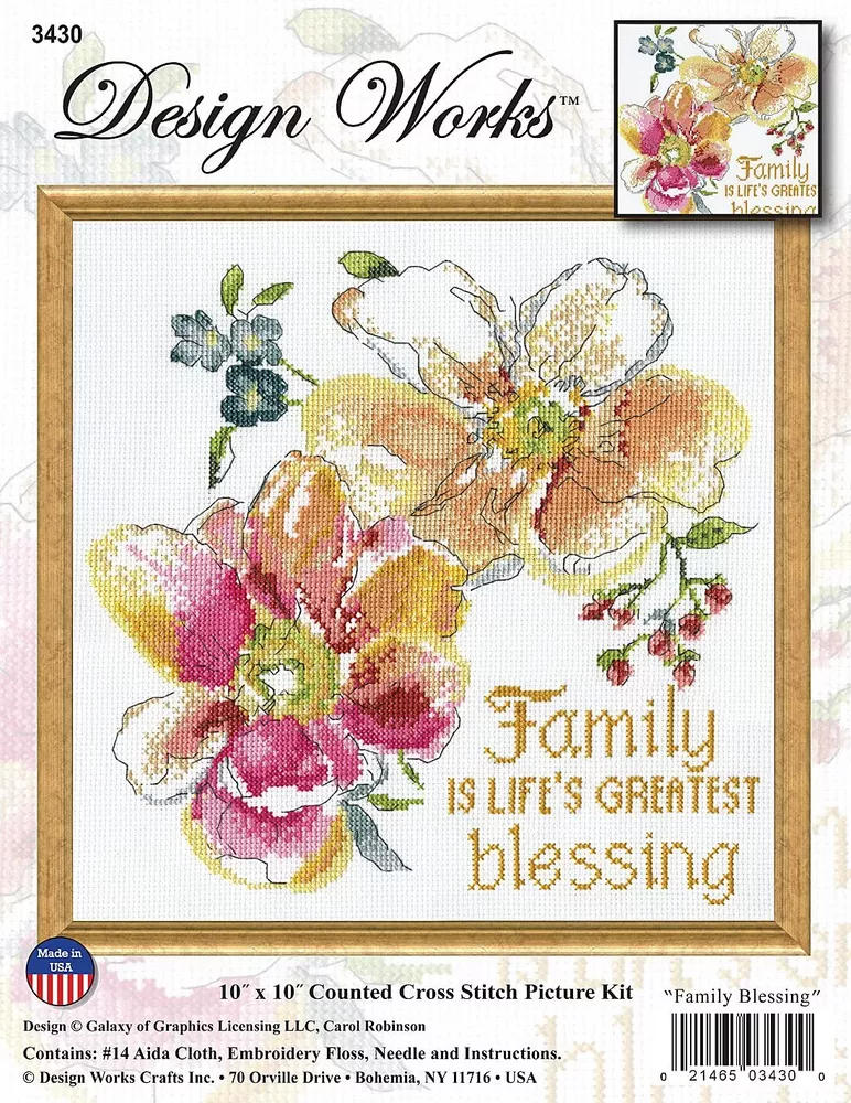 UPC: 021465034300 Size: By the yard gtin13: 0021465034300 ISBN: 0021465034300 Brand: Design Works Package Dimensions LxWxH: 11.02x8.46x0.59 Inches Weight: 0.18 Pounds Type: Does not apply Color: Family Blessings Counted Cross Stitch Kit EAN: 0021465034300