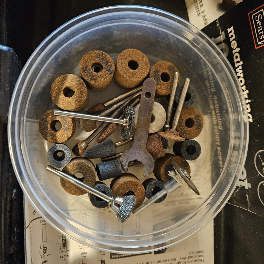 Craftsman Single Speed Rotary Tool (Model 61000) is a corded electric tool kit. It comes with a Craftsman box, accessories, and manual. The tool features variable speed control and a keyed chuck. Made in the United States, this black rotary tool operates at 120V. Tool has been tested and works.