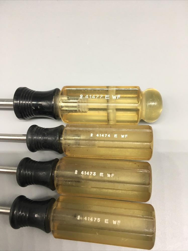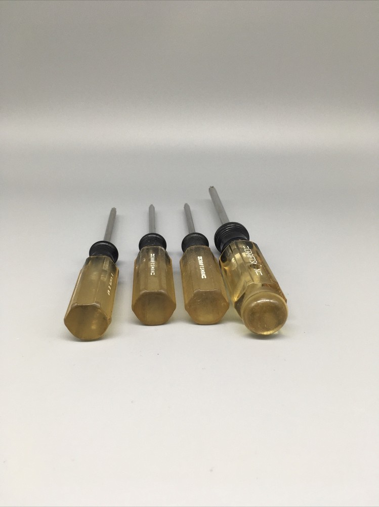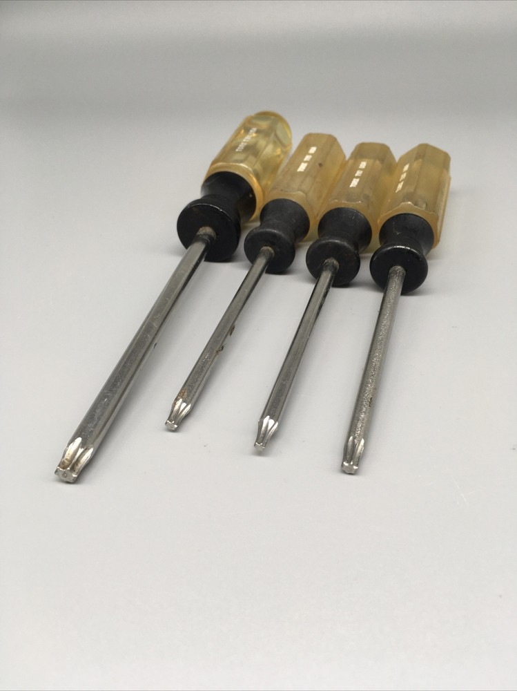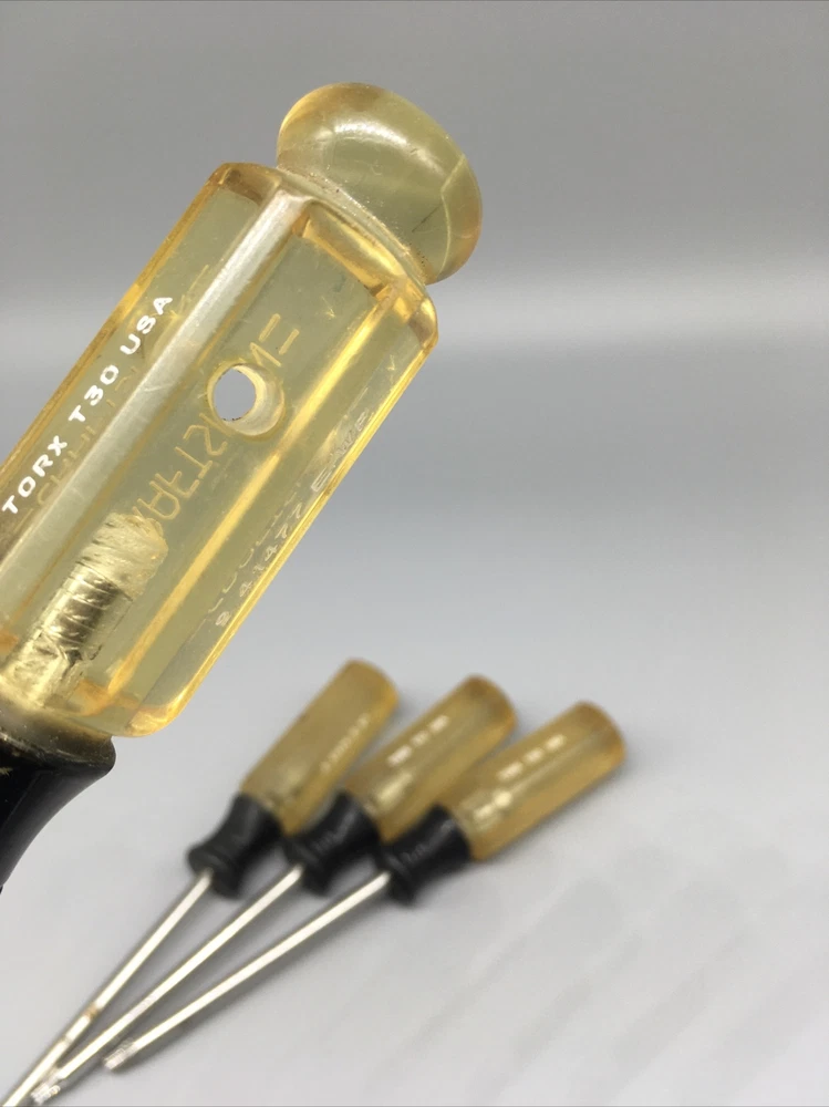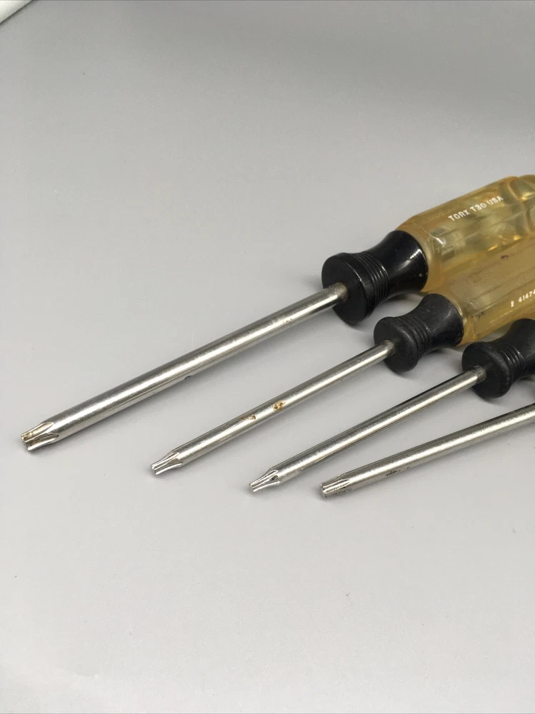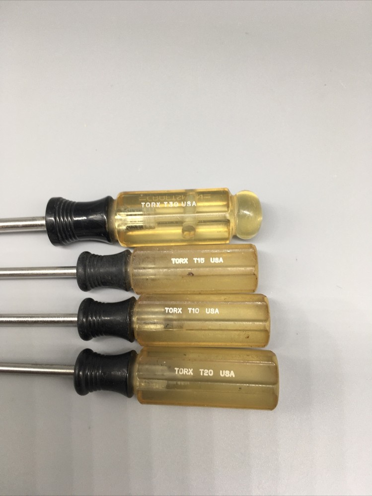 Craftsman USA 4pc. Torx Screwdriver Set T10 T15 T20 T30 - E WF Made in USA 🇺🇸. This is a vintage item, please review pictures carefully for cosmetic condition. The clear part of handle has yellowed as pictured. ** T30 has a hole drilled through handle as pictured. Doesn’t affect its use. *^mb