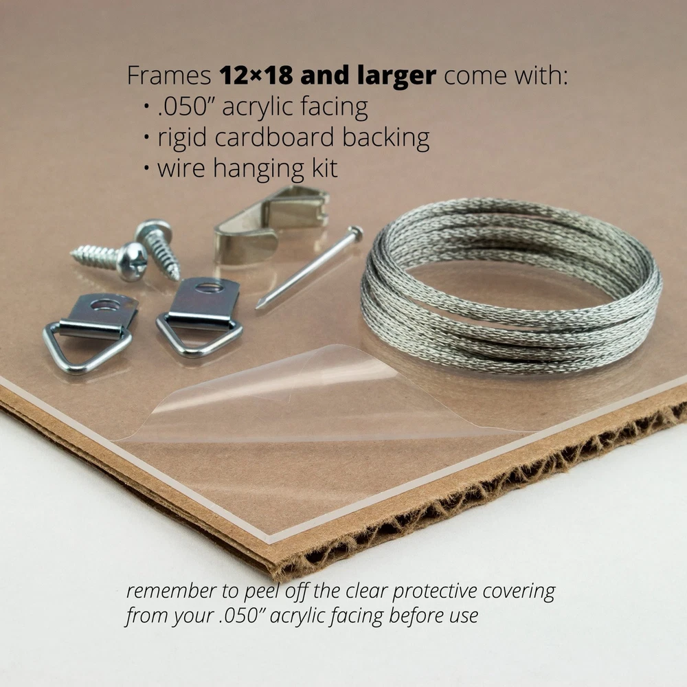 This frame is manufactured in the USA, using the best materials and tools available. Our frames smaller than 12 by 18-inch are carefully assembled with glass facing and a durable backing with two machine-cut, low profile wall hangers for both horizontal and vertical hanging. Contemporary style; black; smooth wrap finish Frame includes: clear acrylic facing, rigid cardboard backing and wire hanging hardware kit (some assembly required) Frame holds a 16 inch by 20 inch photo/print/poster (viewable area is slightly smaller) Frame moulding is 1 inches wide; wood composite material; smooth wrap finish Made in the U.S.A.