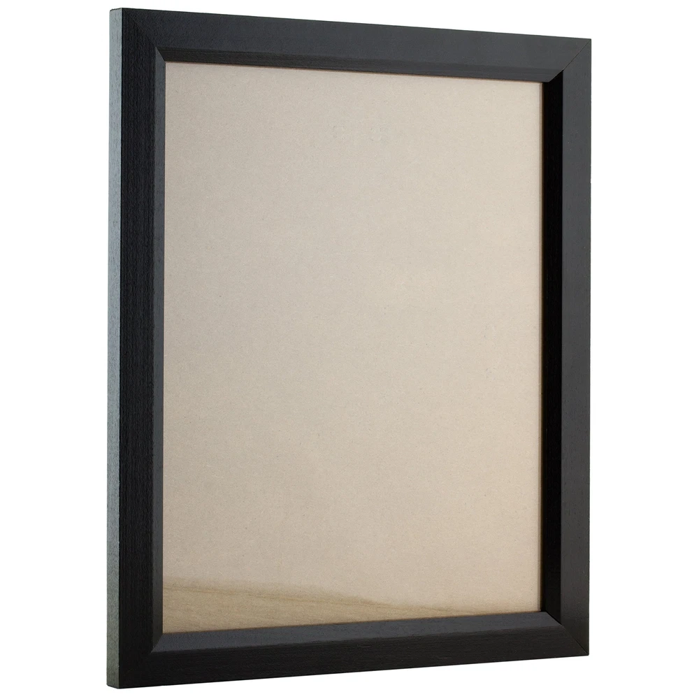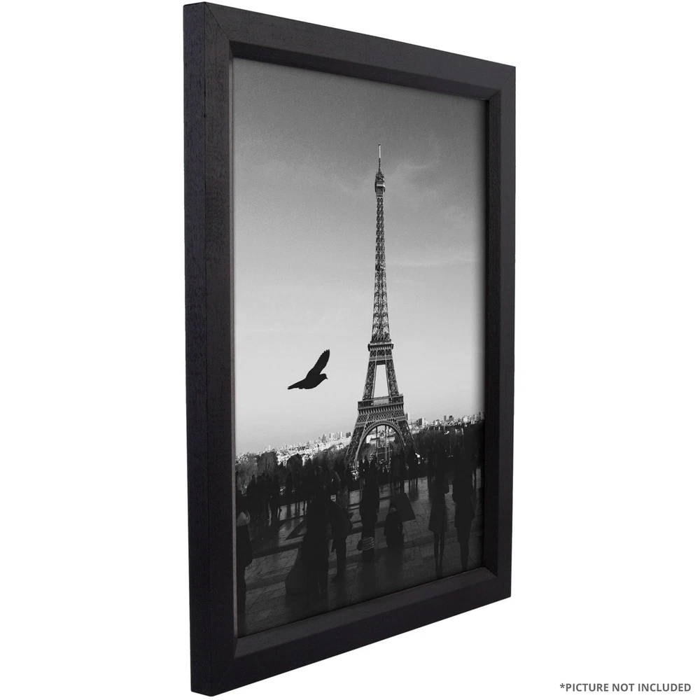 Traditional style; black; wood grain finish Frame includes: glass, rigid black backing and pre-attached stamped hanging hardware Frame holds a 8.5 inch by 11 inch photo/print (viewable area is slightly smaller) Frame moulding is .825 inch wide; solid wood Made in the U.S.A.