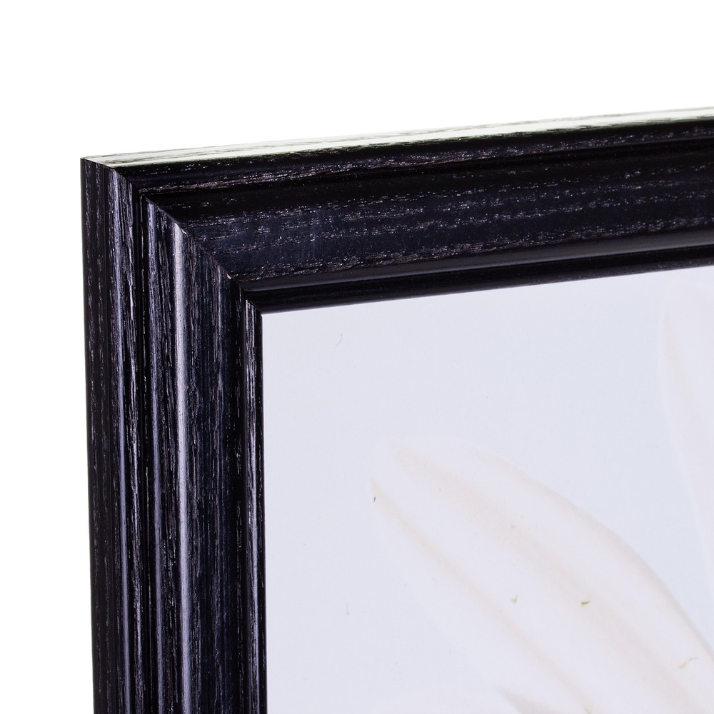Traditional style; semi-gloss black stain finish; visible wood grain **COLOR AND GRAIN PATTERN MAY VARY SLIGHTLY WITH EACH FRAME** Frame includes: white matting, clear acrylic facing, rigid cardboard backing and wire hanging hardware kit (some assembly required) Matted frame is designed to display a 16 x 20 inch photo/print/poster (matting will overlap image by .25" on each side). Frame will display a 20 x 24 inch photo/print/poster without the matting (frame lip will overlap image by .25" on each side). Frame moulding is 0.75 inches wide; solid Ash wood construction Frame is designed for WALL HANGING only (hanging hardware allows for portrait or landscape orientation)
