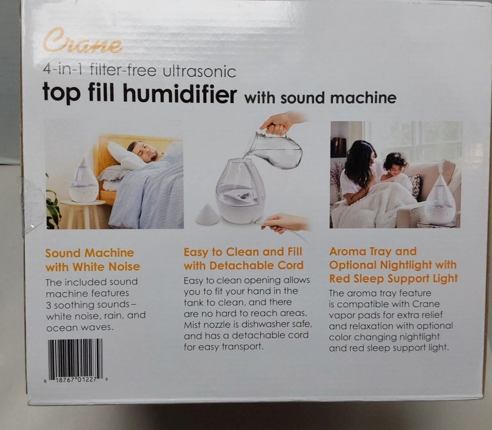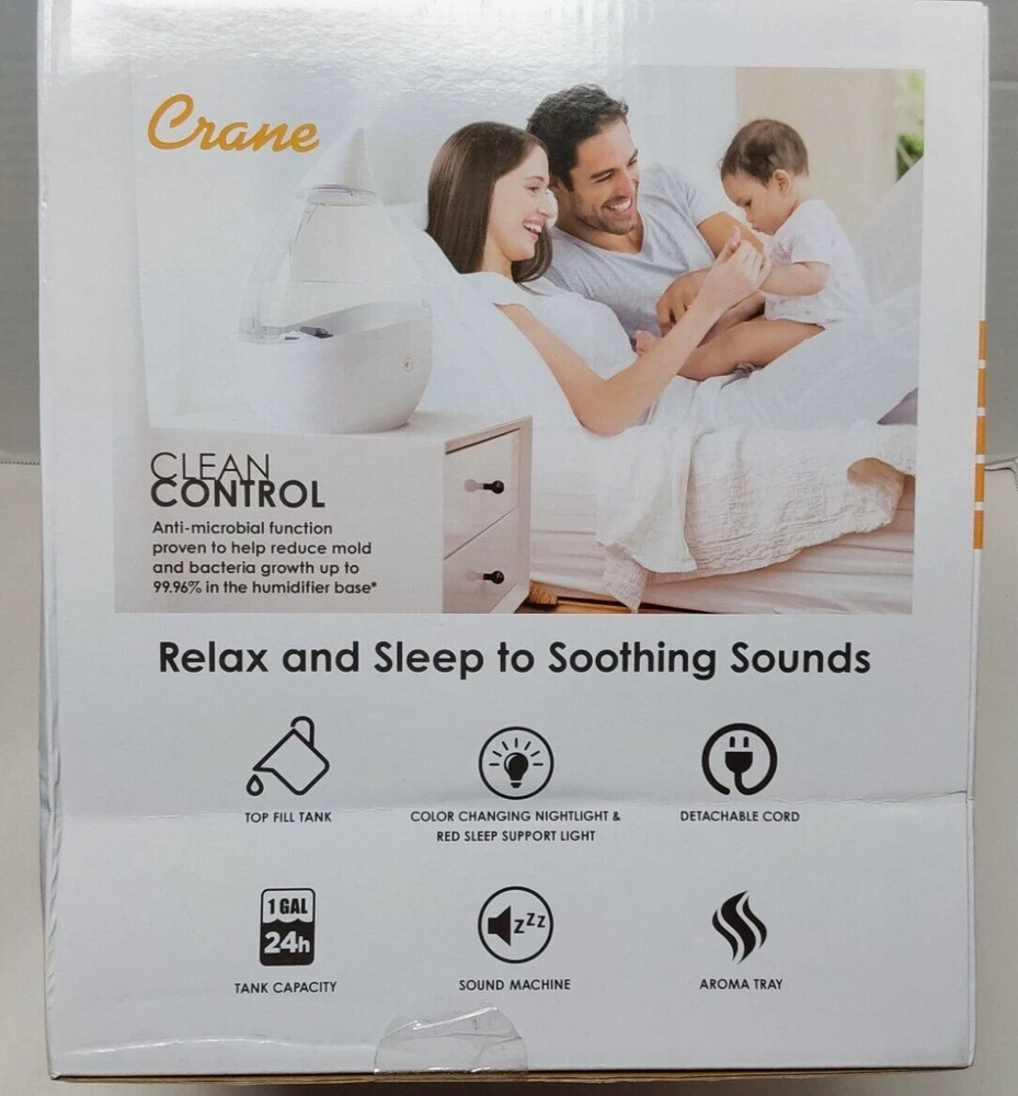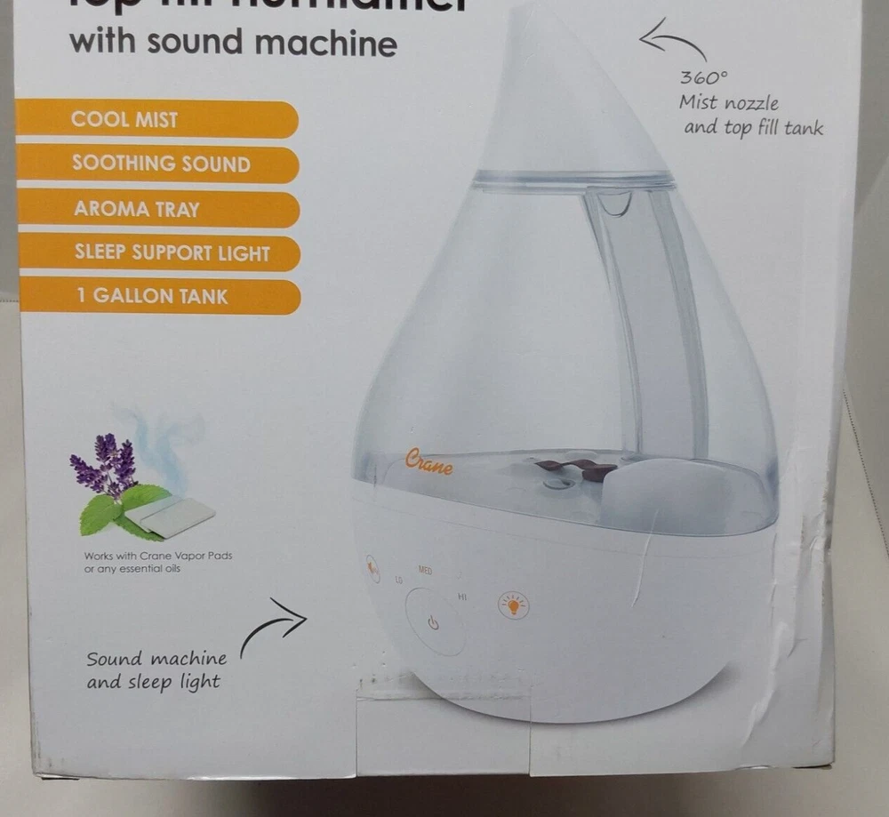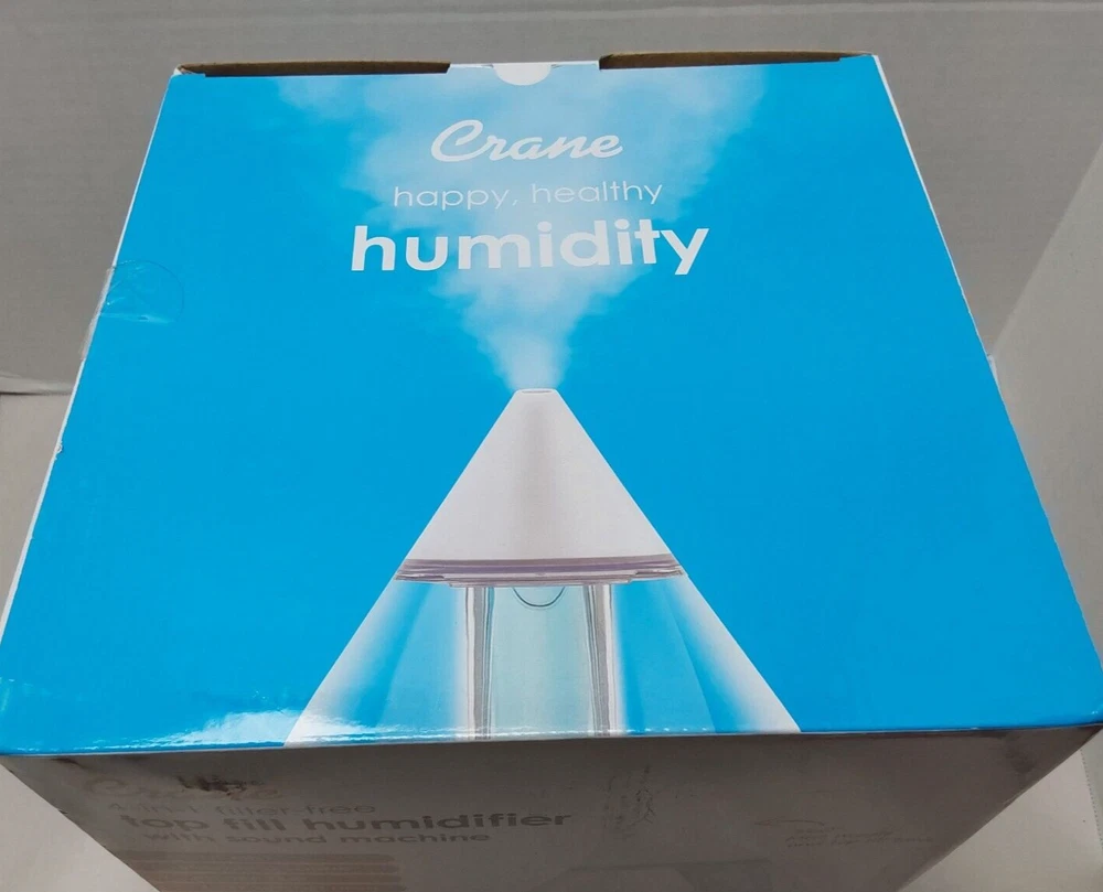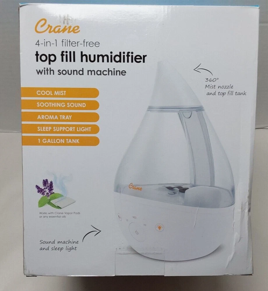 Crane 1 Gal. Top Fill Drop Cool Mist Humidifier with Sound Machine Clear White