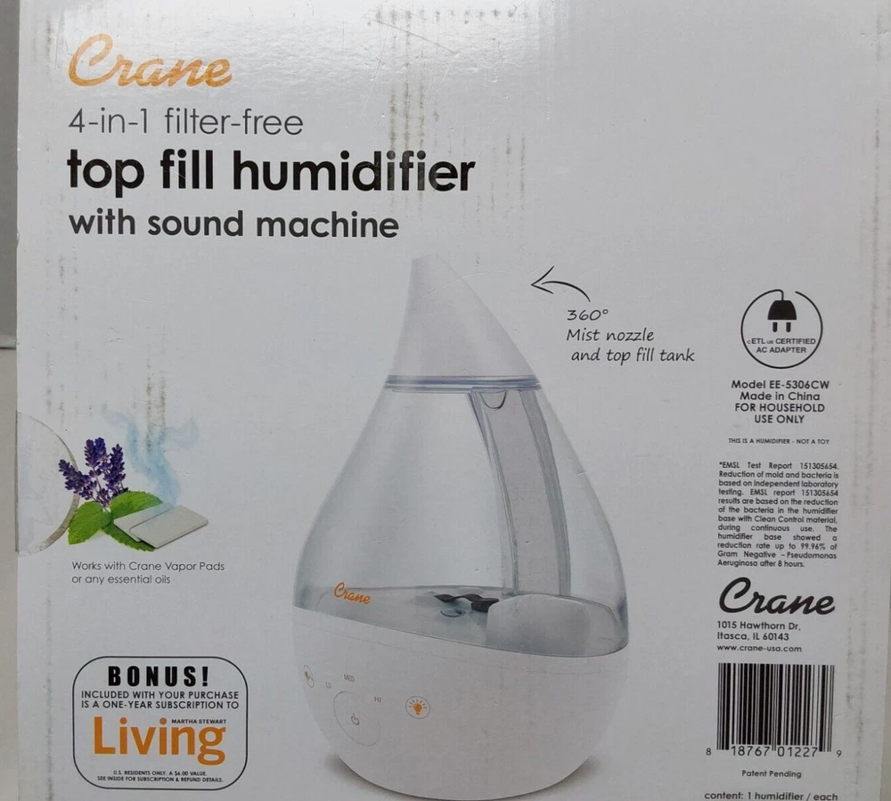 Coverage: 500 sq ft UPC: 0818767012279 Brand: Crane Item Height: 9 in Color: White, Clear Features: Automatic Shut Off, Aroma Diffuser Application: Whole House Timer Control: 24 hrs gtin13: 0818767012279 Recommended Room Size: Medium MPN: EE5306CW Type: Humidifier Tank Capacity: 1 gal (3.8 L) Number of Speeds: 3 Item Weight: 3.84 lbs Humidification Method: Cool Mist Item Width: 13 in Model: EE-5306CW