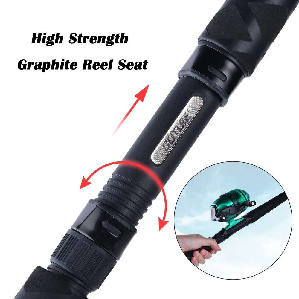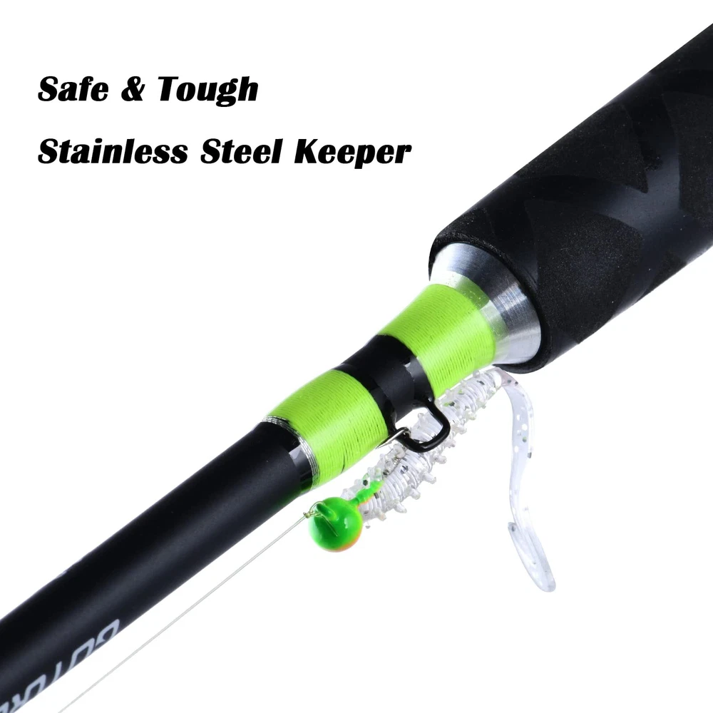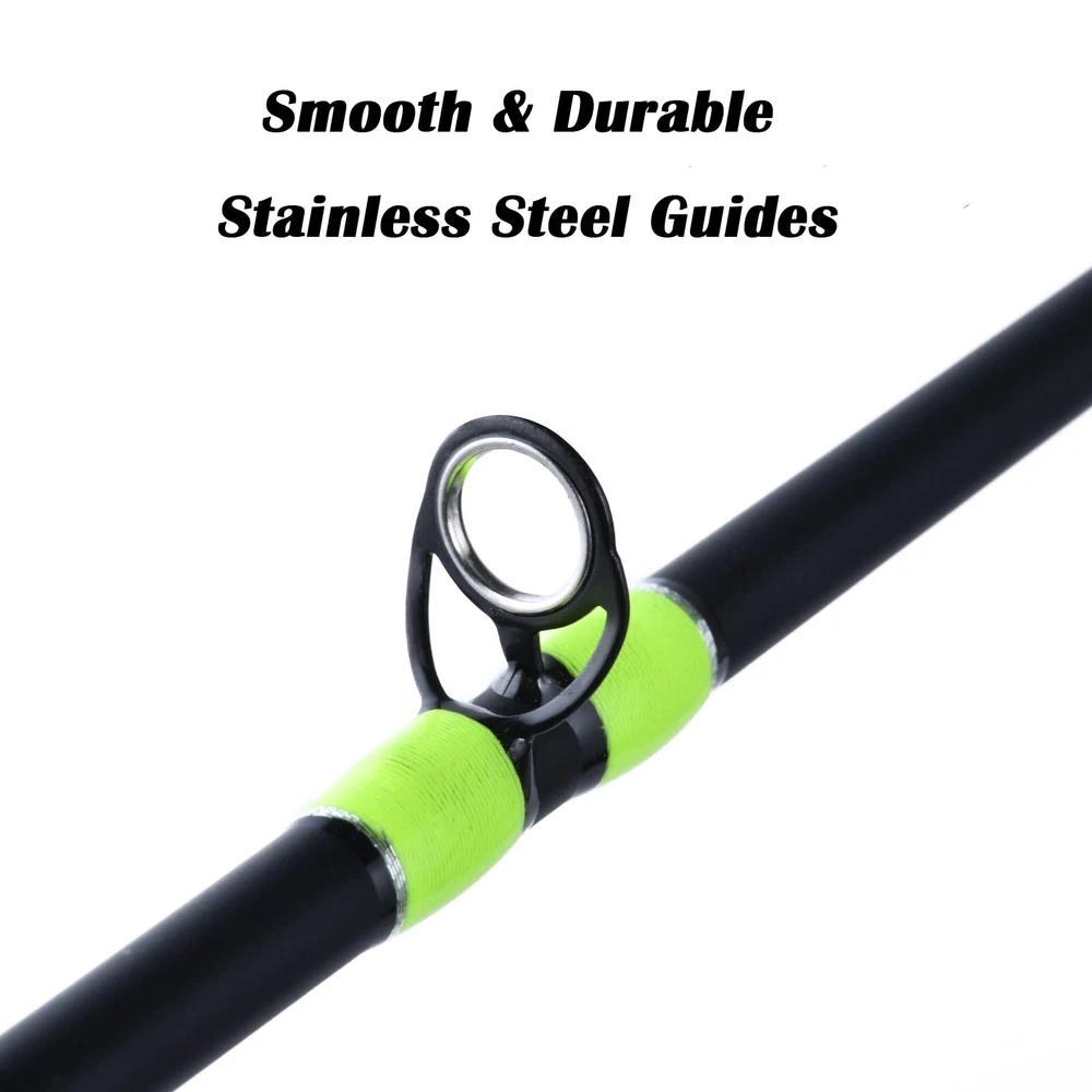 Fishing Rod 1 🎣【Lightweight but durable Blanks】Premium 24T+30T mixed carbon fiber makes the fishing rod powerful, strong, durable, and smooth. The wall thickness of the is not easy to break and the bearing capacity is strong. A tight connection interface brings you a smooth power transition when the casting. 🎣【Striking Green Painted Design】 At each guide eye has fluorescent green painted about 1cm, which is convenient for the angler to observe and control the every slight movement of the fishing rod during the fishing process. The green painted also provides higher visibility at night. 🎣【Excellent Performance】 The ultra light fishing rods deliver incredible performance. The spinning rod adopts stainless steel guide eye and stainless steel ring, smooth, durable, no line damage. Smooth outlet, scratch-resistant, wear-resistant, high heat resistance, high antioxidant activity, and high hardness. The solid reel seat is sensitive operation and has strong stability. 🎣【Comfortable EVA Long Grip】The EVA foamed long grip with a rubber band wrapped around the outer layer, which has good anti-slip performance and light hand feeling. Extended grip adopts the premium lightweight material, comfortable and convenient to outburst-strength, also less hand fatigue. 🎣【Target Fish】The incredible all-around rods are perfect for most species in freshwater, especially for crappie, trout and etc. The crappie rod also can match with spinning reels/spincasting reels/line counter reels. Various operations and fishing methods.