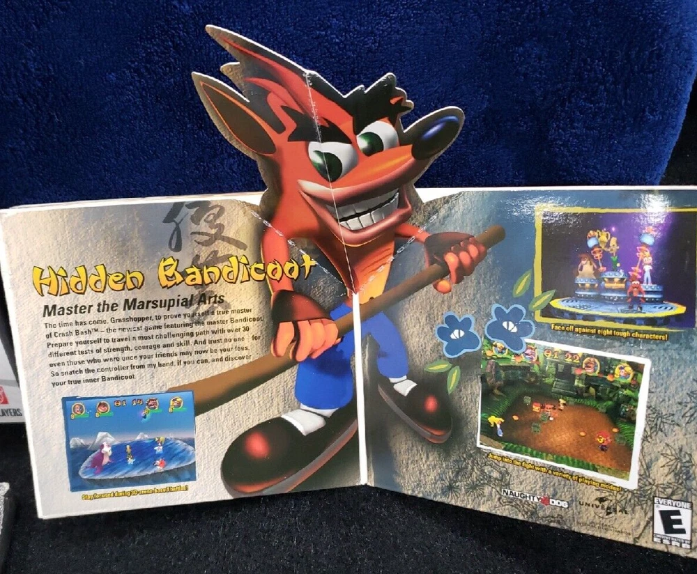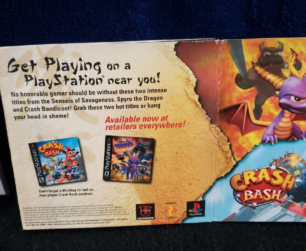 Crash Bash Ps1 Spyro Year Of The Dragon Ps1 Pop-Up Folding Card. Pre-owned still in good condition. The edges of the booklet do show some wear. The graphics on the inside are still vibrant. Please note color may differ slightly from the color shown in the photo due to lighting. Please examine and zoom in carefully as flaws may not be visible from afar. We do our best to identify and disclose all flaws through pictures and/or descriptions we are only human. What is shown in photos is what is included. NOTE: Many of our items are from estate/auction sales and may have been exposed to pets, tobacco products and other unknown contaminants. Shipping Policy We are happy to combine shipping on multiple orders! (Either by combining orders on one invoice or by partial refund). We will ship all items within 1 business day. All items ship from Indiana and take 2-8 days depending on shipping service. On rare occasions, USPS or FedEx may delay a package. Please understand this is out of our control. If you would like an express delivery option, please message us before purchasing, we can update the listing to reflect an express option. (Additional Shipping charges will apply) Feedback If you are satisfied with your purchase, please leave us positive feedback. If there is an issue with your order, please understand we are human and we do make mistakes. Please send us a message and give us a chance to resolve it before returning or opening a dispute with eBay. Disclaimer We are not sponsored by or affiliated with the brands associated with the products being sold. Furthermore, there is no guarantee or assumption that we can provide support or offer any warranty on this product after purchase. Thank you for visiting our listing!