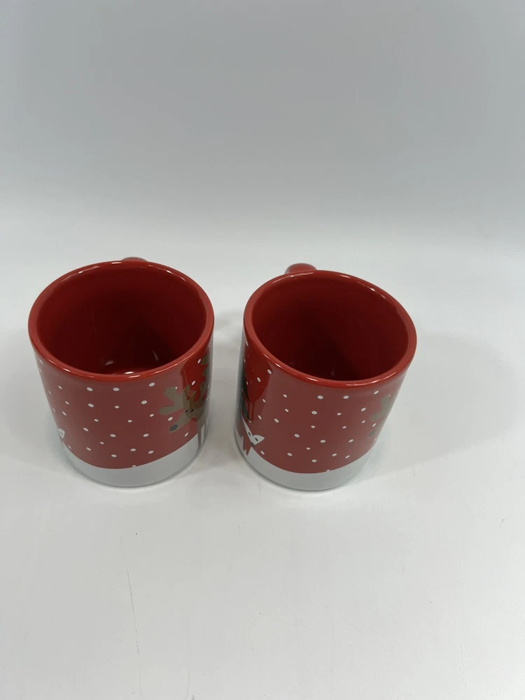 HomeCrate & Barrel 2015 Red Kids Mugs Christmas Reindeer Fox Winter 6oz