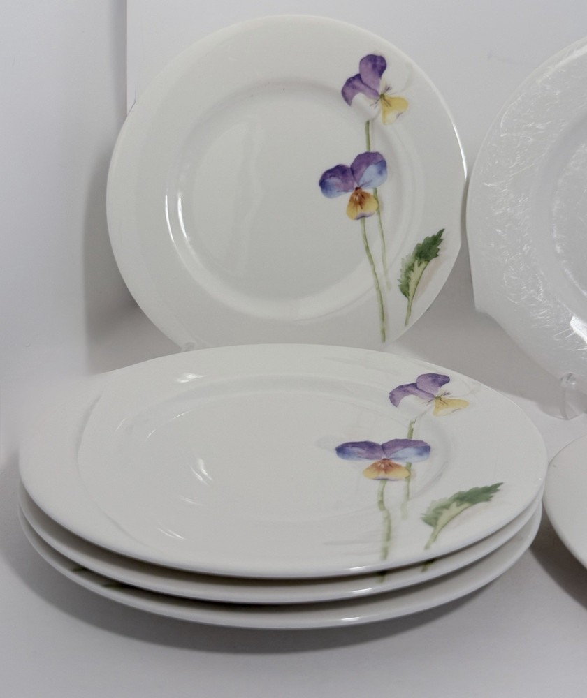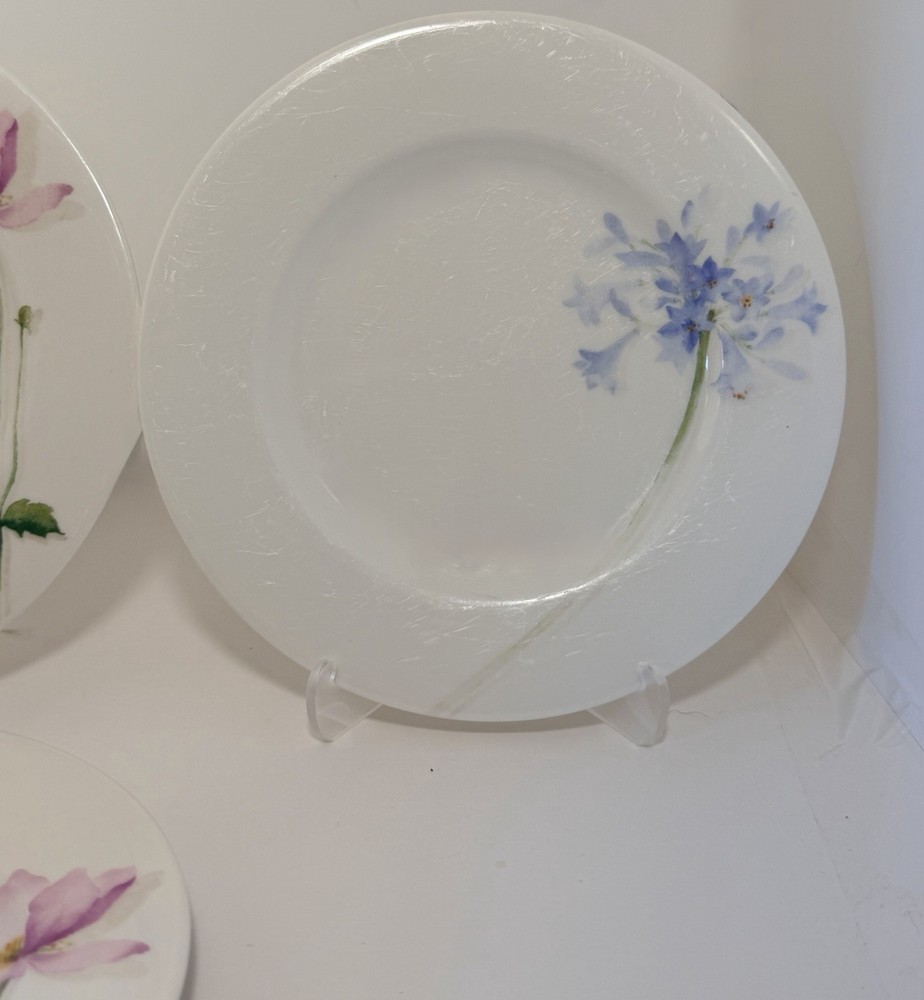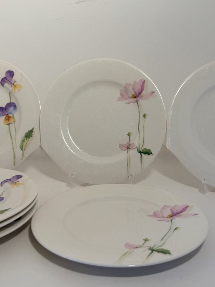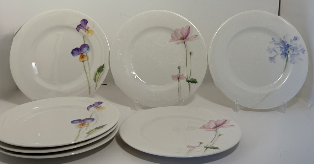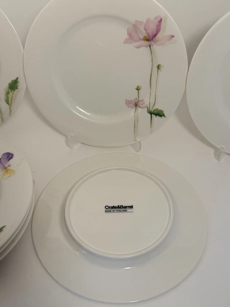 Beautiful set of Crate & Barrel “Flower” pattern ceramic plates, featuring soft watercolor-style botanical designs. Each plate showcases a different floral motif, including pansies, anemones, and agapanthus, giving the set a light, artistic look that works well for everyday dining or casual entertaining. Condition: Pre-owned. Plates show light surface scratches on some pieces, consistent with normal use. No chips or cracks noted. Please review photos closely as they are part of the description. Details: • Set of 7 plates • White ceramic with watercolor floral designs • Contemporary Crate & Barrel style • Perfect for mix-and-match table settings Plates will be packed carefully for safe shipping.