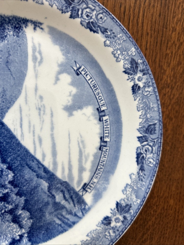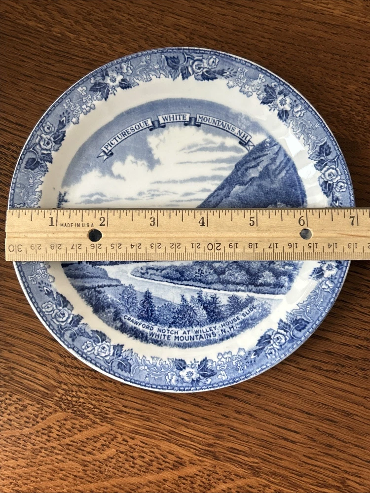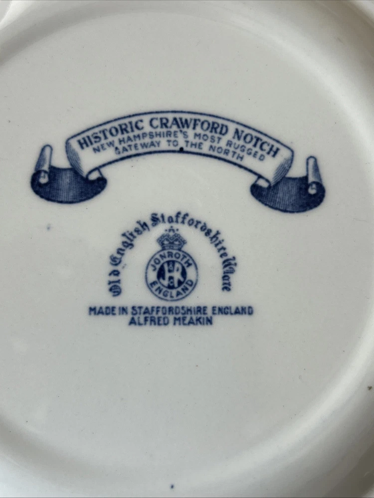 The Crawford Notch - White Mountains, N.H. Staffordshire Jonroth England Plate is a vintage collector's display piece made of ceramic. This round plate features a picturesque design depicting the historic Crawford Notch in the White Mountains of New Hampshire, in a mostly blue color scheme. Produced by the Staffordshire brand in the United Kingdom, this art pottery piece is a unique and charming addition to any collection of decorative collectibles, showcasing the beauty of the English culture and craftsmanship.