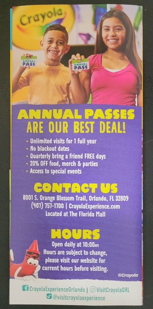 Crayola Experience Brochure Guide Flyer Orlando Florida NEW 2023 Coupon Map Uncirculated NEW Condition!!! Thank you for considering a purchase from us. We have been part of Ebay for over 20 years! (Oct 2002) We sell a variety of services, yes, it is a service, we are selling the service of picking up free maps and sending them to you for a small fee. Please see our other auctions for a variety of map set services. We invite you to ask questions about our services. All auctions are sent USPS First Class, no tracking. Latest 2023 Park Maps.