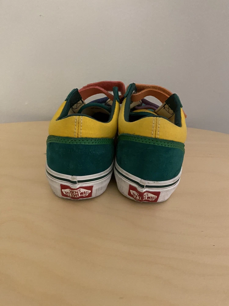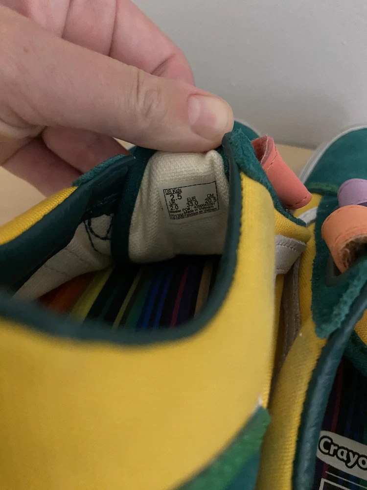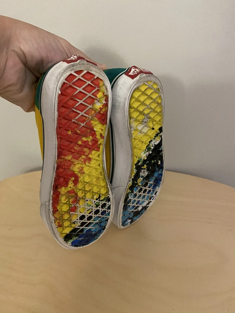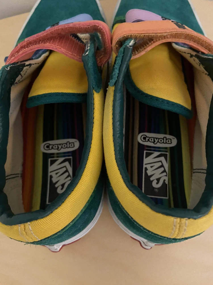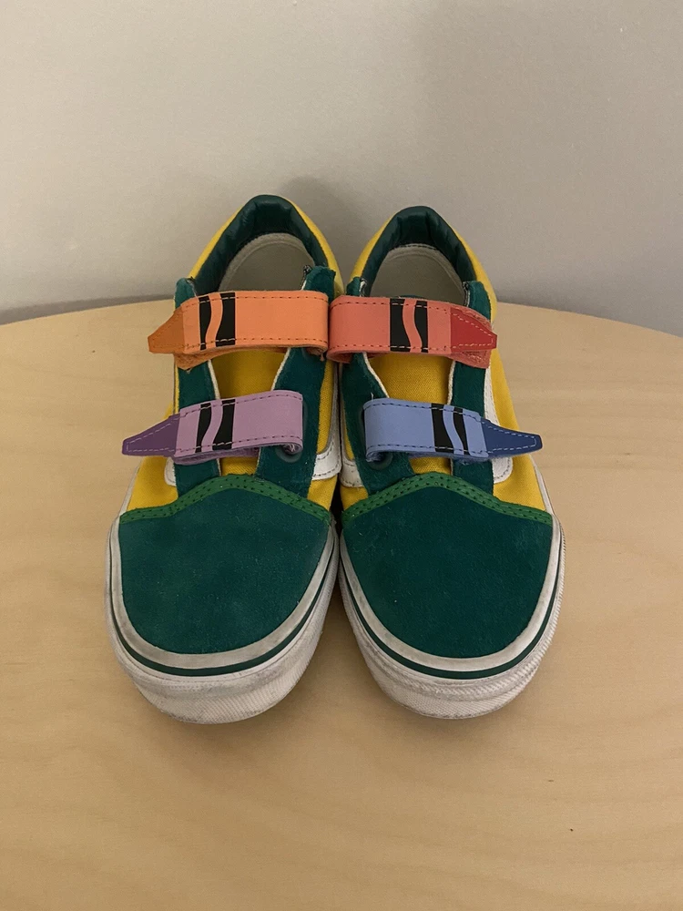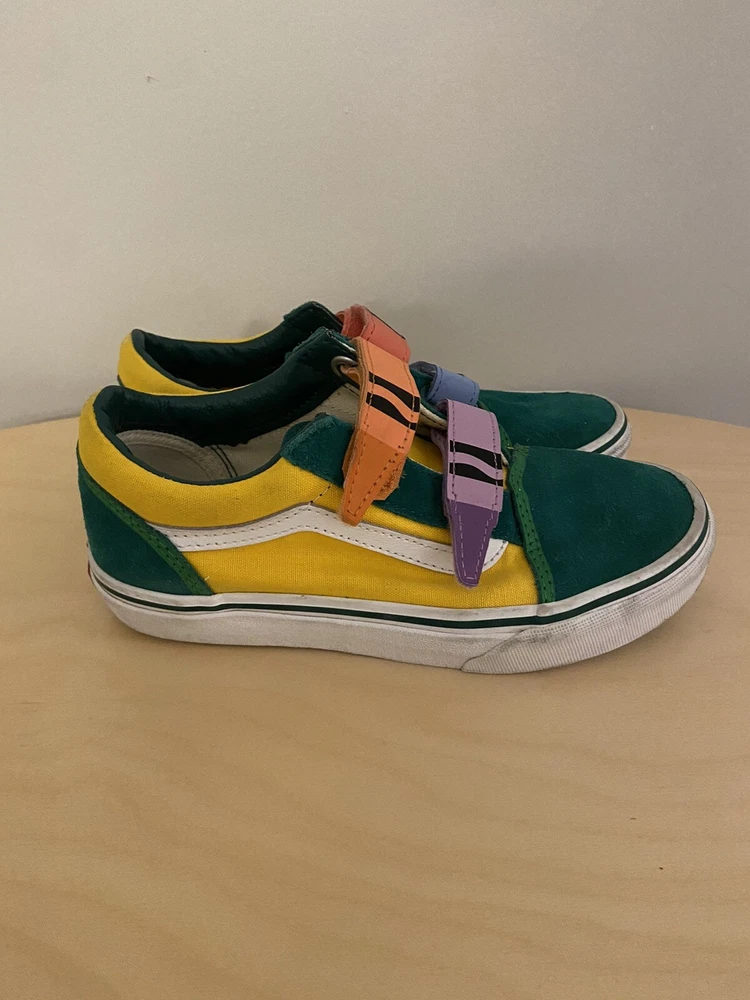 See pictures for wear and discoloration, scuffs on soles Introducing the limited edition Crayola Kids Vans in size 2.5. These colorful sneakers are perfect for school and casual wear, featuring a fun art-inspired design that will make any outfit stand out. With the iconic VANS Old Skool product line, these shoes are sure to be a hit with both boys and girls alike. The multicolored theme and unisex design make these shoes a versatile addition to any wardrobe, while the durable construction ensures they will last through all of their adventures. Whether they're using them for art class or just hanging out with friends, these VANS are the perfect choice for any young fashionista. Don't miss out on this opportunity to add a unique and stylish touch to their shoe collection.