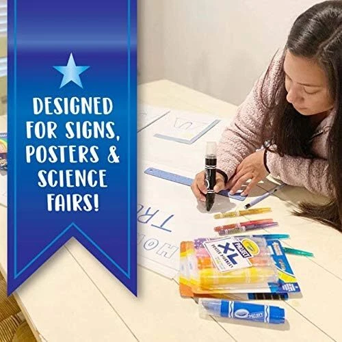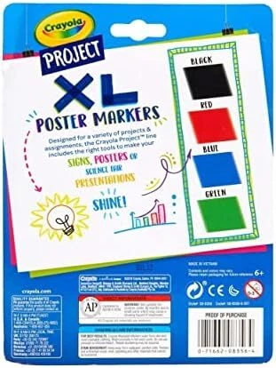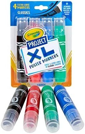 CRAYOLA POSTER MARKERS: Includes 4 XL poster markers for posters, signs, decorations, and more. COLORED MARKERS: Features Black, Green, Blue, and Red markers. EXTRA LARGE: These supersized markers are perfect for a variety of full-coverage art projects and crafts CHISEL TIP: Create thick or thin lines with these bold, chisel tip markers from Crayola. ART SUPPLIES: School projects stand out with these heavy duty Crayola markers in classic colors. WASHABLE MARKERS: Wash clean from skin and most washable clothing. SAFE AND NONTOXIC: Ideal for adults and kids, ages 6 & up.
