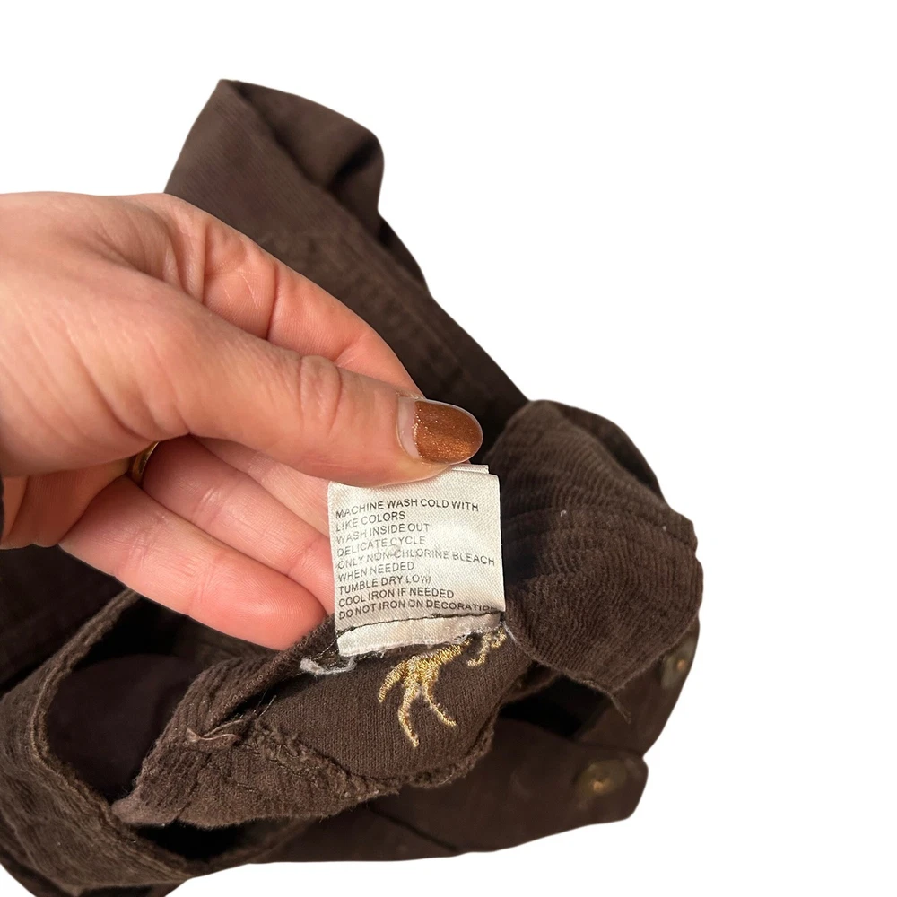 Soft corduroy overalls in a deep chocolate brown feature charming embroidered gold horses throughout. Crafted from 100% cotton, these durable bibs include adjustable button straps, a functional front chest pocket, and convenient snap closures along the inner legs for easy changes. The classic straight-leg silhouette is finished with two back patch pockets and side button entries. Measurements: • Waist: 10" (20" doubled) • Inseam: 9.5" Keywords: Equestrian, Horse Girl, Western, Corduroy, Vintage Style, Fall Fashion, Toddler Overalls, Country, Farmhouse, Rustic, Dark Academia, Preppy, Classic Kids Brand: Cre8ions Type: Overalls Material: 100% Cotton Color: Brown Pattern: Embroidered Horse Sleeve Length: Sleeveless Closure: Button / Snap Pockets: 5-Pocket Design Fabric Type: Corduroy Season: Fall, Winter, Spring Accents: Embroidery, Buttons All items come from a smoke free, golden retriever dog friendly home. All of items unless NWT or Dry Clean Only are washed with Tide. We try our best to disclose any flaws with items, if we miss something please reach out and let us know.