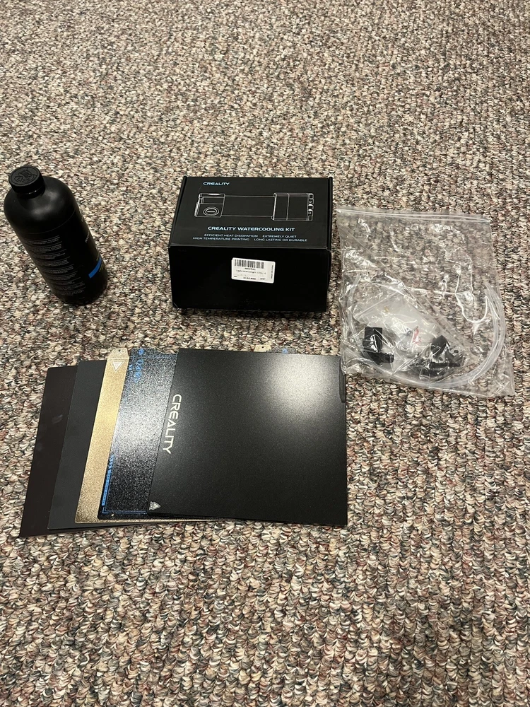 MODS Creality Water Cooling Kit Creality Ceramic Heating Kit Custom dual fan part cooling IN BOX Printer Assorted spare parts Water cooling with liquid SD Card Extra Build plates Fabric Insulated Enclosure with Exhaust Port