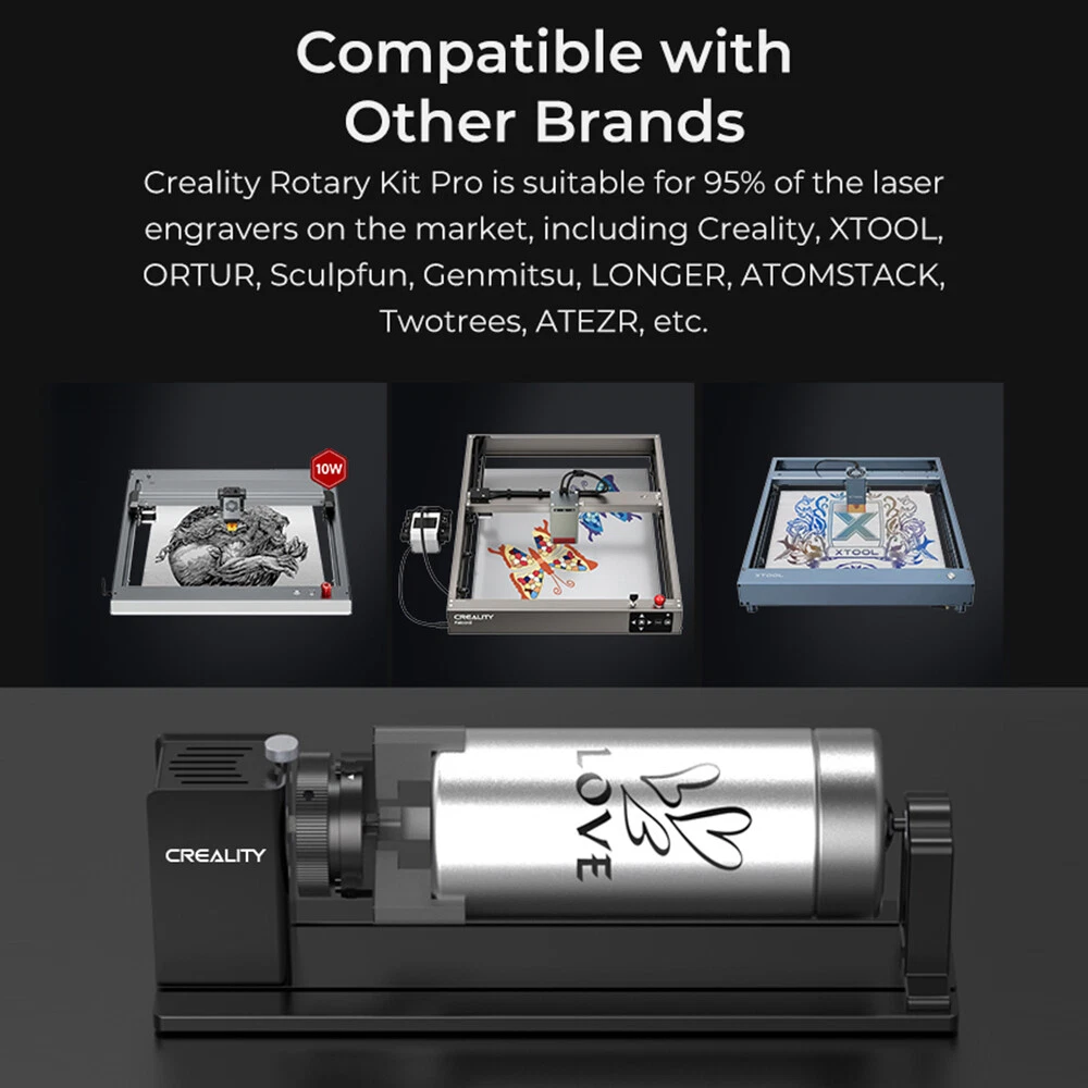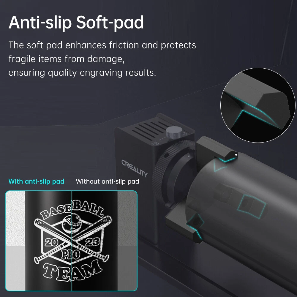 Title Resin Other K1 Series DIY Printer Laser Engraver 3D Printer Accessories 3D Printer Filament Lcd Printer 3D Scanner Creality Rotary Kit Pro 3 in 1 Laser Rotary Roller for Most Laser Engraver R3Z8 Features: Multifunctional Adjustable Jaws: One set of adjustable jaws can handle objects of all shapes with external clamping and internal support. One-handed Clamping of Engraved Items: The set screws help stabilize the rotary chuck, making it easy to clamp engravings with one hand without requiring multiple operators. Adjustable Rotary Chuck & Anti-slip Soft-pad: The rotary chuck enables 360° of rotating engravin. It can be adjusted to fit large, tiny objects with the hex stud and jaws. The soft pad enhances friction and protects fragile iteams from damage, ensuring quality engraving results. Wide Compatibility :Creality Rotary Kit Pro is suitable for 95% of the laser engravers on the market, including Creality, XTOOL, ORTUR, Sculpfun, Genmitsu, LONGER, ATOMSTACK, Twotrees, ATEZR, etc. Specification: For: Creality laser engravers and cutters, and other machine Dimensions: 360*122*100mm Diameter Range: Clamp from the outside Cylindrical objects with a diameter of 1-110mm Prop up from the inner side Cylindrical objects with a diameter of 25-75mm Hex stud Sphere with a diameter of 10-130mm or rings, braclets and other ring-shaped objects with a diameter of 15-100mm Applicable Works: 1.cylinders: such as thermos cups, mugs 2.cone: such as goblets, conical bottles 3.hemispheres: bowls 4.spheres: such as crystal balls, oranges 5.Ring body: such as rings, bracelets Packing List: 1 x Creality Rotary Kit Pro Kit Product Description: Payment Delivery Terms of sales About us Contact us Payment We accept payment via Payoneer. Please accomplish payment within 5 business days after you won the item. Delivery All your orders will be shipped within 1-2 business days and updated tracking info. Please make sure your address is full and correct, so that your order will be soon shipped and delivered smoothly. Most orders will adopt standard shipping, which usually needs 3-5 biz days. Any PO BOX addresses need to be confirmed if delivery or not. Terms of sales 1-month-returning for all orders after they are proved defective/damaged/faulty (videos or photos about it are preferred). Address on the package is not the return address, please email us firstly to get the correct return address. About us * Founded in 2014 by four 3D printing enthusiasts, Creality is a top global manufacturer of 3D printers. Our range of products includes DIY and resin 3D printers, 3D scanners, laser engravers, and filaments. Currently we host four brands of 3D printers: Creality as the master brand, and the three sub-brands of Ender, HALOT and Sermoon. Capitalizing on our innovatively leading technologies and products, we also offer consumer and professional printing solutions for makers, designers, schools and enterprises. Contact us Customer Service Hours: 9:00AM - 18:00PM BST (Beijing Standard Time) . You can also contact our official website customer support.
