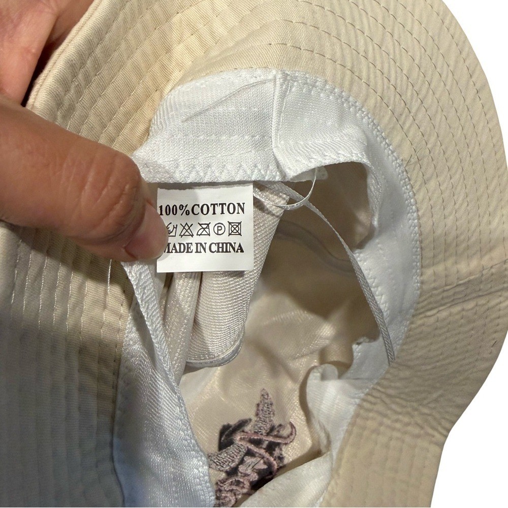Cream cotton bucket hat with pink embroidered "Angels" graphic featuring halo and wings detail. Super soft girl / coquette / Y2K vibe. Easy neutral cream tone that pairs perfectly with spring and summer outfits. Details: • Cream / light beige color • Pink embroidered Angels script • Halo + wing detail • 100% cotton • Lightweight and breathable • One size (no size tag visible) • Made in China