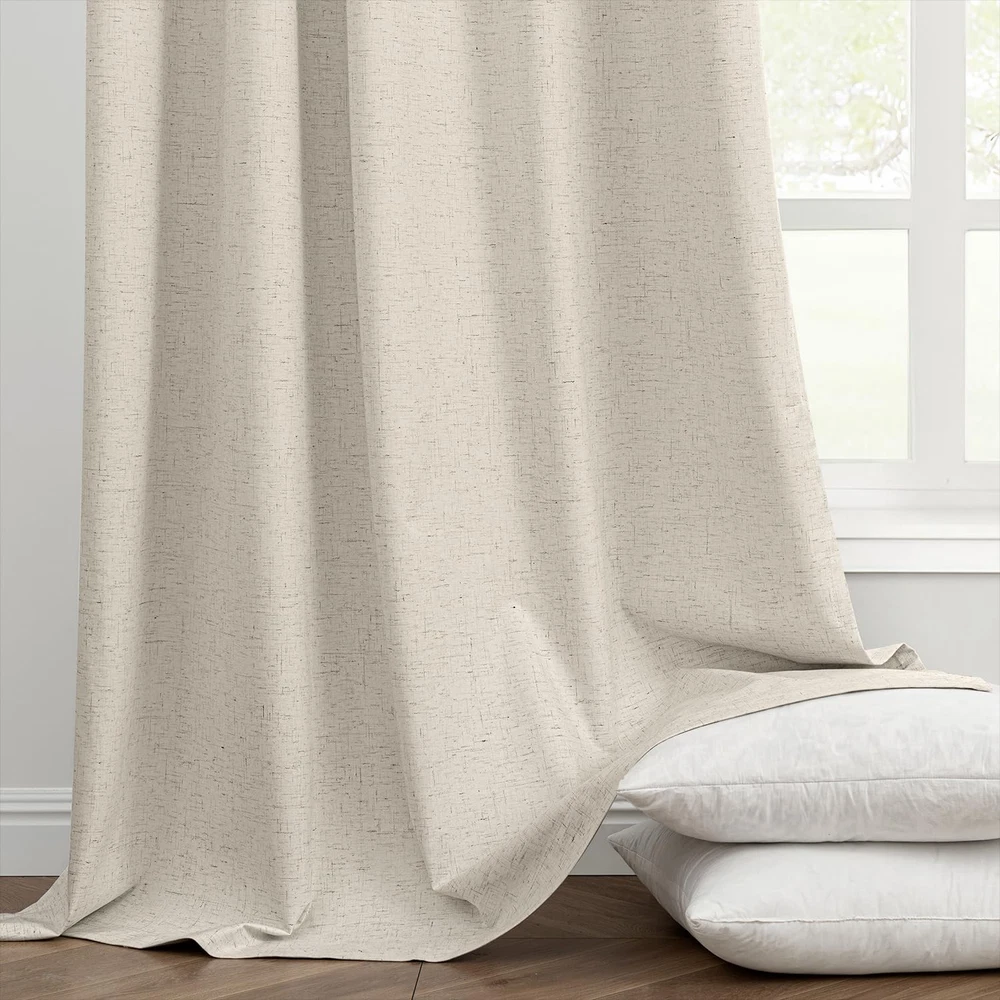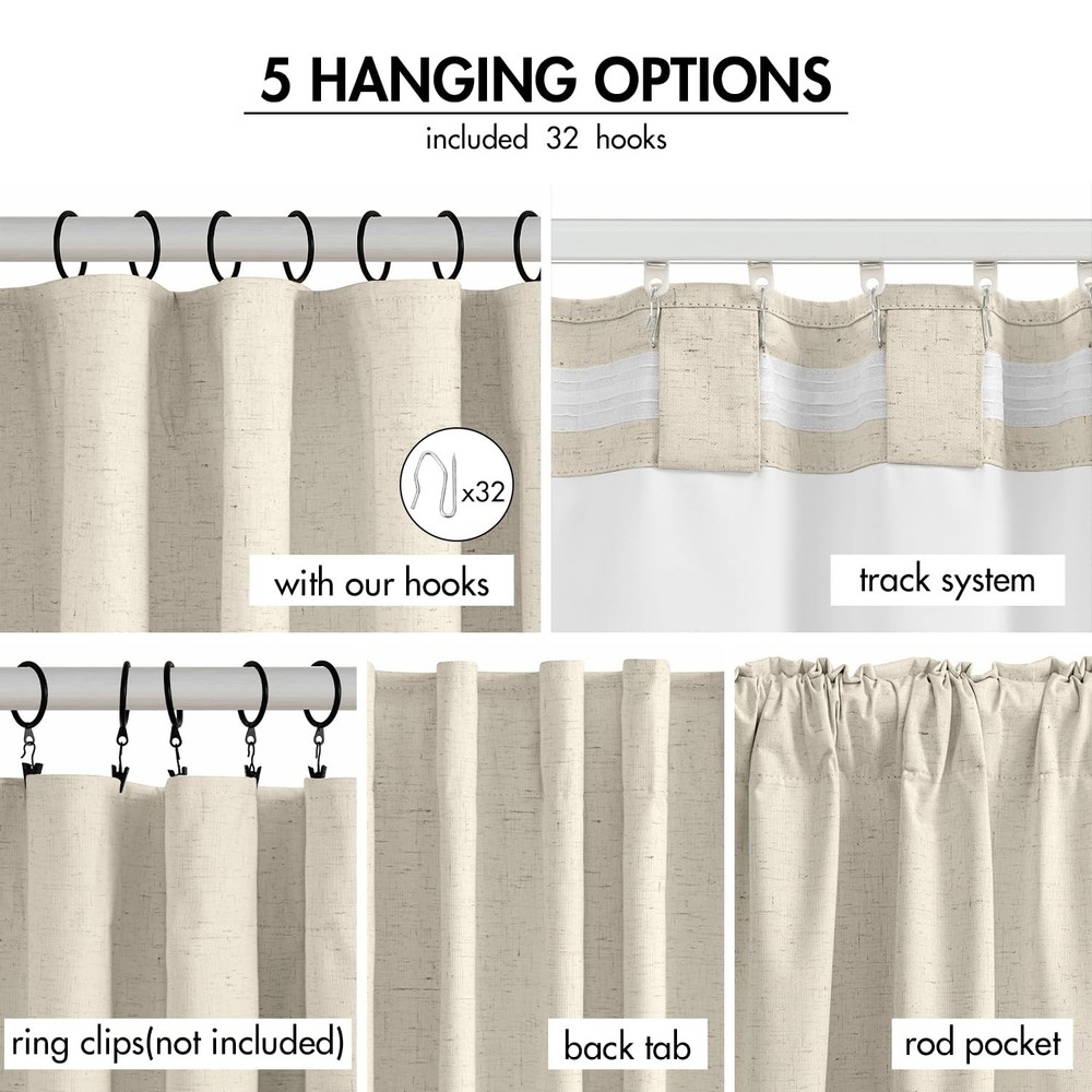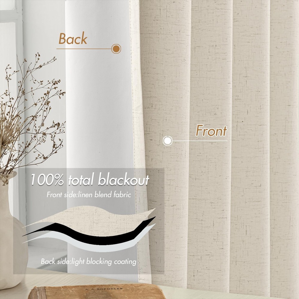 Our premium blackout curtains combine luxury with durability, perfect for peaceful sleep or stylish decor. Crafted from high-quality fabric, they block 100% sunlight, reduce noise, protect privacy, and regulate temperature. With 3-in-1 top design (pleat tape, back tab, rod pocket) and 32 hooks, they offer versatile hanging options. The curtain panels fit most windows, enhancing any room. Easy to care for - machine wash cold, tumble dry low, and low-temp iron. Upgrade your home with these stylish, functional curtains today. 100% Blackout Curtains: Our blackout curtains can block 100% of sunlight, reduce noise, and protect privacy. This blackout curtain can balance the temperature, so you won't feel hot in summer and cold in winter. At the same time, protect your furniture, flooring, and other items from sunlight damage. Premium Quality Material: These blackout curtains are made of high-quality linen fabric, which not only feels good, but also durable. Whether you want to ensure a peaceful sleep in the dark or create a fashionable focal point in your living space, these blackout curtains are the ideal choice. Multiple Hanging Options: Each package includes 32 HOOKS. Each curtain panel has 3-in-1 top style design: pleat tape, back tab and rod pocket. Curtains also can be hung with clip rings. 5 ways meet your various needs. Complete Package: Our package includes 2 curtain panels, each measuring 52" wide and 84" long. Perfect size to make your windows stand out and upgrade any room in your home Easy Care: If there are wrinkles when opening the packaging. Cool iron on front side as needed. Don't iron on the back side of 100% Blackout White Coating Layer. Machine washable in cold water and do not bleach, tumble dry low. Any questions please feel to .